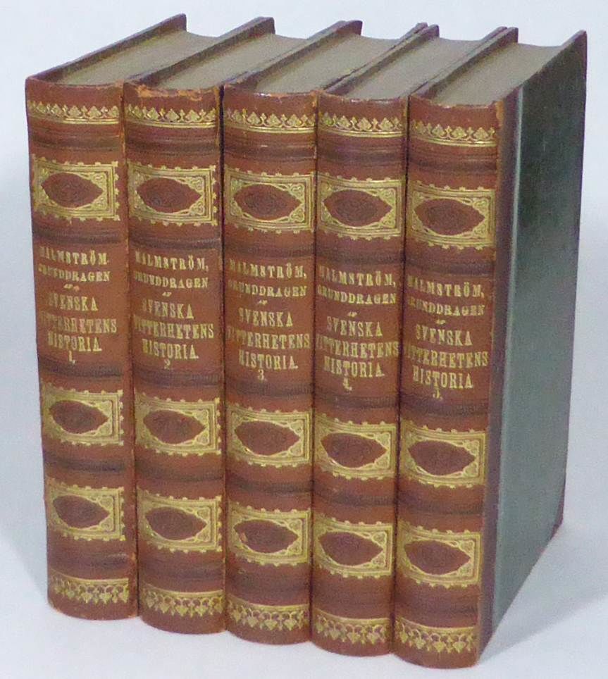 Örebro; Abr. Bohlin, 1866-1868. 20,5x14 cm. xii, 608 & viii, 546 & viii, 524 & vii, (1 blank), 471, (1 blank) & vii, (1 blank), 455, (1 blank) + (2, 2 blanka), 39, (1 blank) s. Fem volymer i samtida rödbruna halvfranska band (Kindbergs bokbinderi, Jönköping) med marmorerade pärmpapper. Ryggarna lätt blekta och aningen nötta. Andra volymen med ett par korta sprickor vid rygghuvudet. Fjärde volymen med reva i främre försättsblad. Bra inlagor med endast ett fåtal spridda småfläckar. Verket utgavs posthumt. Svenskt Litteraturlexikon skriver: ""I denna litteraturhistoria uppehåller sig M. särskilt vid perioder och författare, som tidigare blivit otillräckligt belysta; stort utrymme ägnas frihetstiden och gustavianska tiden. Huvudvikten ligger på en vidräkning med romantiken.""