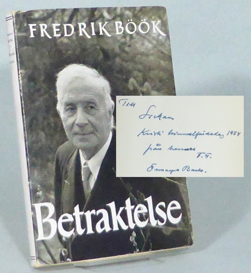 Stockholm; Bonniers, 1954. 20,5x14 cm. 175, (2, 1 blank) s. Häftad med tryckt omslag, tryckt skyddsomslag med foto av Lennart Nilsson. Delvis ouppskuren. Skyddsomslaget aningen nött. Fint ex. Boken är i likhet med ""Rannsakan"" från 1953 en sorts politisk tänkebok med inslag av memoar. Dedikation: ""Till Sickan / Kristi himmelfärdsdag 1954 från hennes F. B. / Önnarps Backe."" Mottagare var Gun Böök-Hederström (1917-2019), dotter till Fredrik Böök. Arvidsson, Fredrik Bööks bibliografi 1898-1967, 3067.