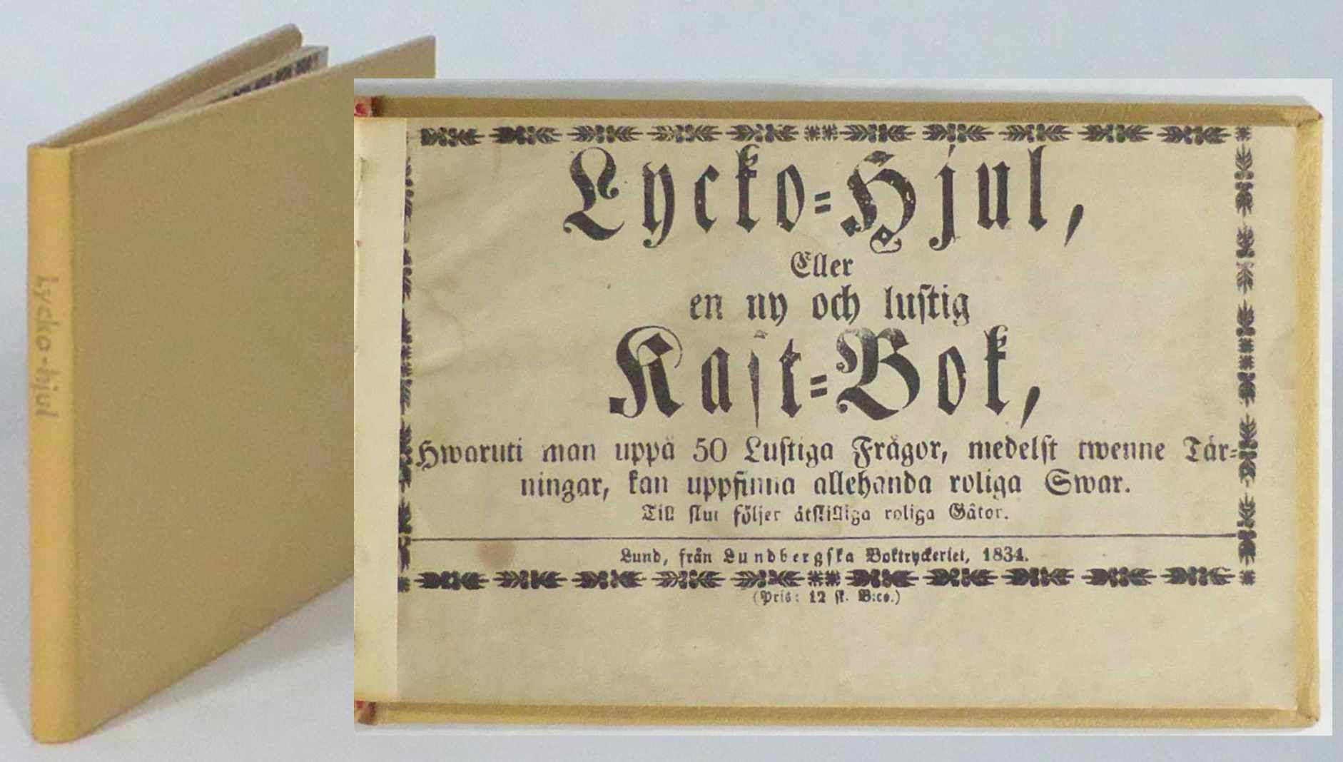 Lund, från Lundbergska Boktryckeriet, 1834. Tvär 8:o. 10,5x16,5 cm. Inbunden i ett senare diskret gulbrunt klotband med förgylld ryggtitel. Något snåla inre marginaler, titelbladet hårt beskuret i övre marginalen samt med några svaga fuktfläckar. S. 3/4 med liten hörnförlust nedtill. Ett fåtal spridda svaga fuktfläckar. Välbevarat exemplar av denna folkbok som trycktes ett antal gånger från mitten av 1700-talet till mitten av 1800-talet. Man väljer en av bokens 50 frågor, t. ex. ""Om fästemannen dör förr än fästmön?"", ""Om barnet är ditt eller ej?"", ""Af hwad färg kläder anstå enom bäst?"", går sedan till det hjul som har samma siffra som frågan, kastar tärningarna varpå man söker upp svaret, som kan bli ""Du önskade att din fästeman wore död, men du får en wärre igen"", eller ""Jag fruktar att barnet är icke ditt"".