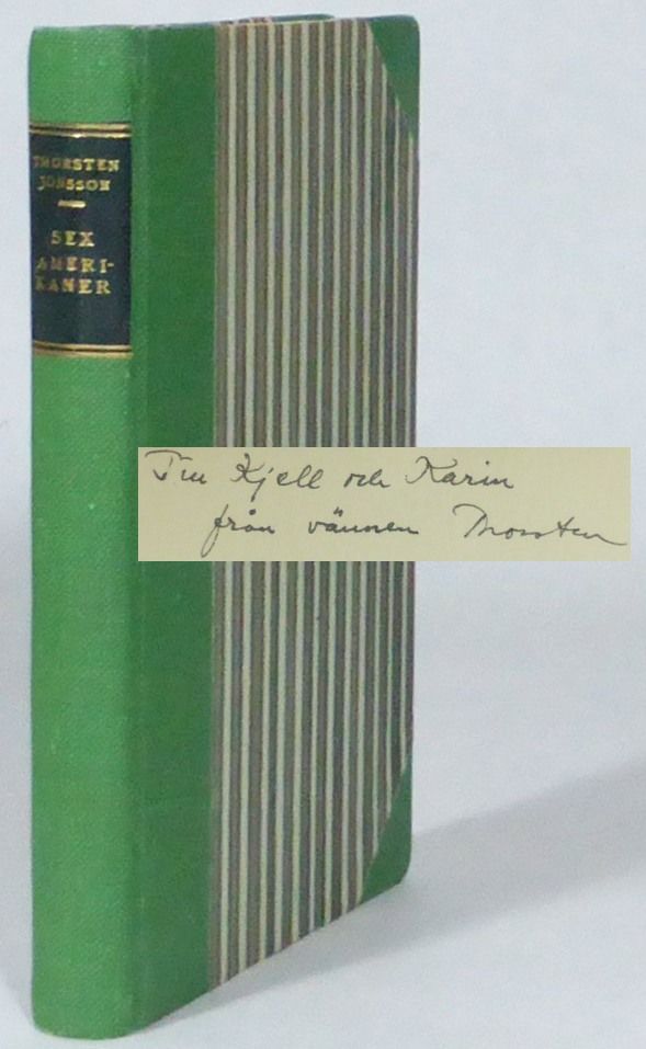 Stockholm; Bonniers, 1942. 19,5x13 cm. 171, (1) s. Osignerat samtida grönt halvklotband med ryggetikett i mörkare grönt skinn, mönstrade pärmpapper. Omslaget medbundet. Exlibris för Anders Berglund. Några svaga skrapmärken på pärmarna. Bakre omslag med ett riss i yttermarginalen. Fint ex. Jonsson var DN:s förste utrikeskorrespondent i USA 1943-46 och blev sedermera tidningens kulturredaktör. Hans insats som översättare och kritiker, inte minst av den samtida amerikanska litteraturen, anses ha varit högst betydelsefull för Faulkners Nobelpris. Dedikation: ""Till Kjell och Karin från vännen Thorsten"". Mottagare var konstnären Kjell Rosén med fru. Jonsson och Rosén var vänner sedan den gemensamma skoltiden i Umeå och bodde båda senare i Stockholm, där Rosén 1941 utförde en oljemålning av Jonsson för familjen Bonniers räkning.