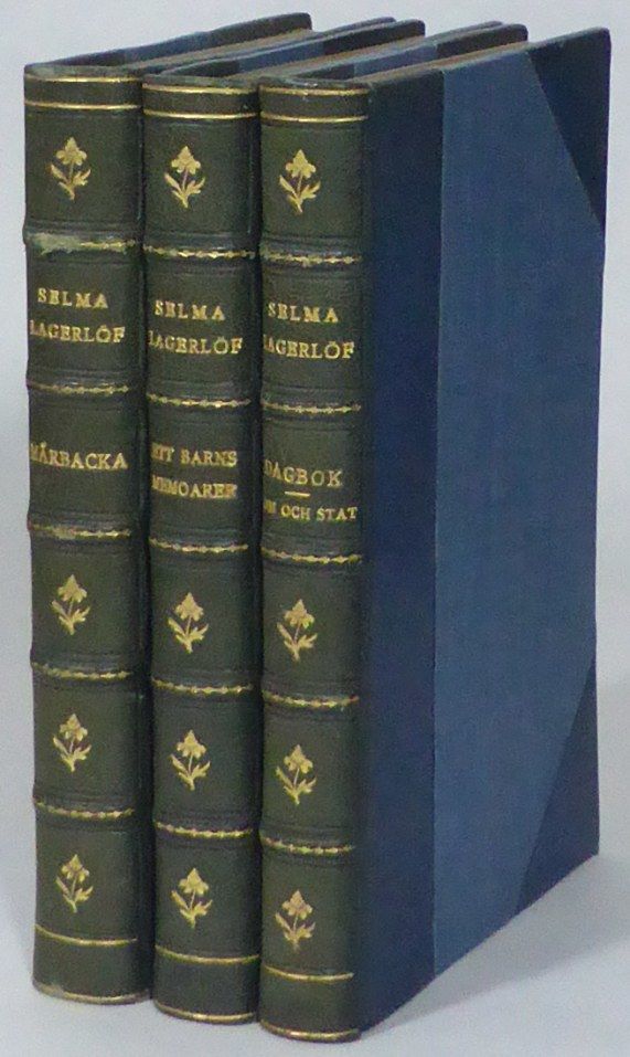 Stockholm; Bonniers, 1922-1932. Originalupplagor, olika tusenden. 19,5x13,5 cm. 327, (2, 1 blank) & 314 & 229, (1, 2 blanka) s. + 4 porträttplanscher. Tre samtida blå halvfranska band (Hedberg) med förgylld ryggdekor och upphöjda bind, blått klot på pärmarna, övre guldsnitt och marmorerade försättsblad. Samtliga omslag medbundna. Pamfletten Hem och stat medbunden i sista volymen, omslaget bevarat. Ryggarna lätt mörknade och något nötta, pärmhörnen lite nötta. Första volymen med en liten fläck på främre snittet. Tredje volymen med ett skrapmärke på främre omslag. Fina inlagor. Fin uppsättning av Lagerlöfs memoarsvit. Afzelius, Selma Lagerlöfs bibliografi 297 & 429 & 465 & 183.