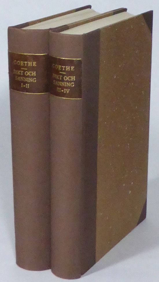 Stockholm; Bonniers, 1923-25. (Memoarer och sedehistoria II). Originalets titel: Aus meinem Leben. Dichtung und Wahrheit (Tübingen, 1811-1822). 22,5x16 cm. 314 & 337, (1 blank) & 319, (1 blank) & 188 s., samt porträttplansch i varje del. Illustrerad. Två senare osignerade bruna halvklotband med ryggetikett i brunt skinn, marmorerade pärmpapper. Samtliga omslag medbundna. Första volymen med aningen tilltryckt rygghuvud samt en liten fläck på främre snittet. Andra volymen med ett litet skrapmärke på ryggetiketten. Omslagen aningen solkade. Första svenska utgåvan. ""Goethe gick icke till sitt verk för att göra en generalbikt och icke heller för att hålla ett försvarstal inför världen. Den uppgift han ställde sig var att i levande sammanhang och med hög tendens berätta sin personlighets utvecklingshistoria. Vad verket innehåller av biografiska detaljer, lokala skildringar, intressanta tidsomständigheter och figurrika kulturbilder tjänar alltså genomgående denna inre plan, som återigen avser att låta levnaden kristallisera sig till ett konstverk. I fråga om bred och molnfri överblick når ingen självbiografi upp till Goethes; ingen har varit mäktig av en så fullkomlig objektivitet i bedömandet av de många samverkande krafter och inflytelser, som bilda ett stort människoöde."" (förord).