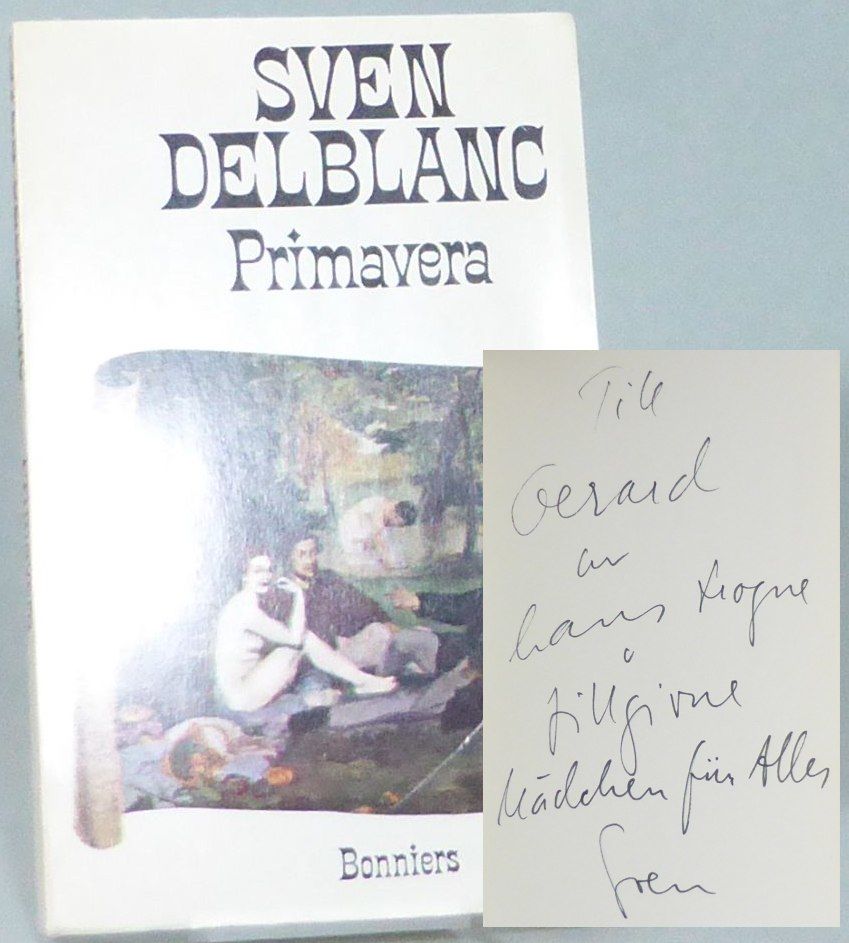 Stockholm; Bonniers, 1973. Originalupplaga. 21x13,5 cm. 158, (1, 1 blank) s. Häftad med tryckt omslag. Det överdimensionerade omslaget är aningen veckat i nedre marginalen. Fint ex. Dedikation till förläggaren Gerard Bonnier: ""Till Gerard av hand trogne o tillgivne Mädchen für Alles / Sven"".