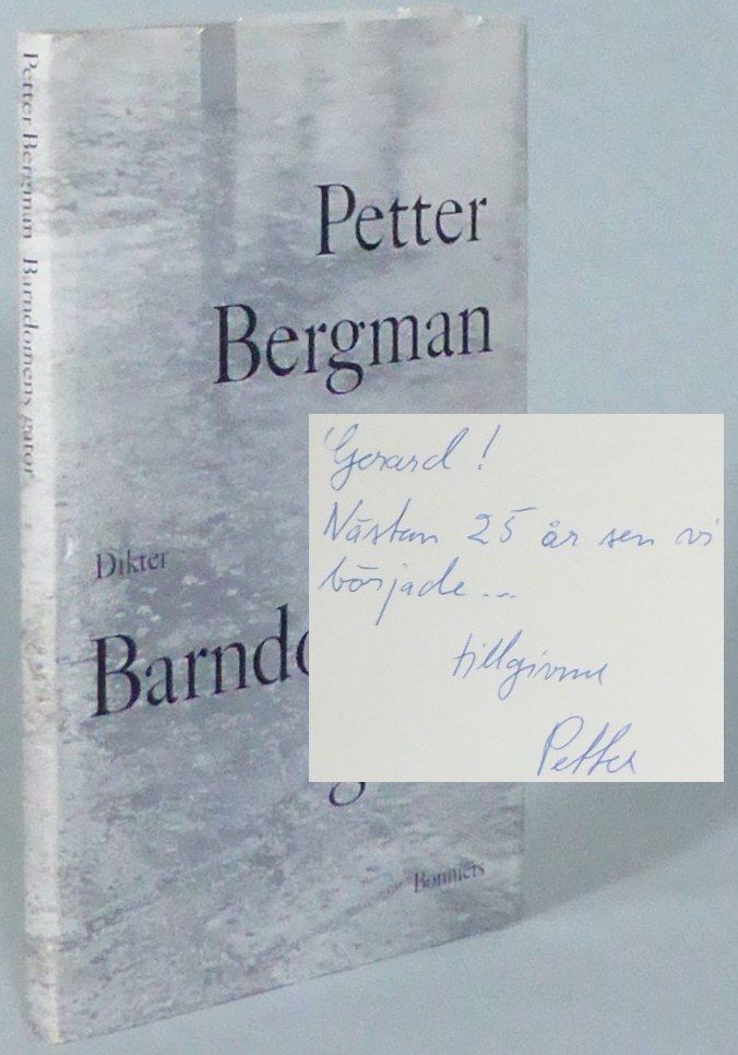 Stockholm; Bonniers, 1983. Originalupplaga. 22x14 cm. 89, (3) s. Förlagets pappband med tryckt skyddsomslag. Lätt tilltryckta ryggändar. Omslaget med några riss i övre marginalen. Dedikation till förläggaren Gerard Bonnier: ""Gerard! Nästan 25 år sen vi började / Petter"". Bergman (1934-1986) debuterade i Metamorfosgruppens skriftserie 1952 och publicerade sin första bok på Bonniers 1954, där han utgav sina följande diktsamlingar, varav detta blev den sista.