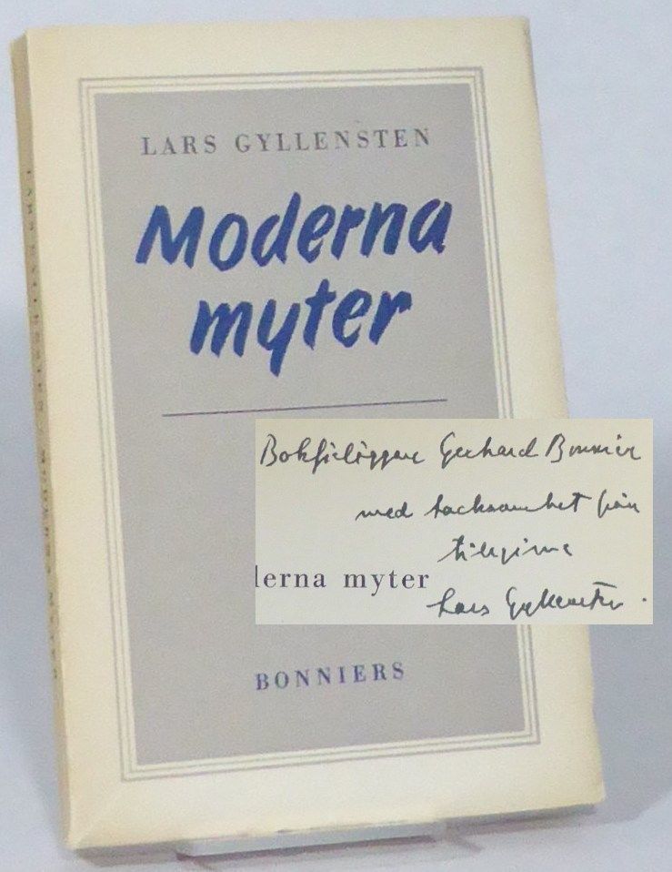 Stockholm; Bonniers, 1949. Originalupplaga. 19,5x13 cm. 171, (3) s. Häftad med tryckt omslag. Det överdimensionerade omslaget är aningen veckat i nedre marginalerna. Fint ex. Gyllenstens seriösa debut, som utgör första delen i en ""dialektisk trilogi"", följd av ""Det blå skeppet"" (1950) samt ""Barnabok"" (1952). Dedikation till förläggaren Gerard Bonnier: ""Bokförläggare Gerhard Bonnier med tacksamhet från tillgivne Lars Gyllensten"".
