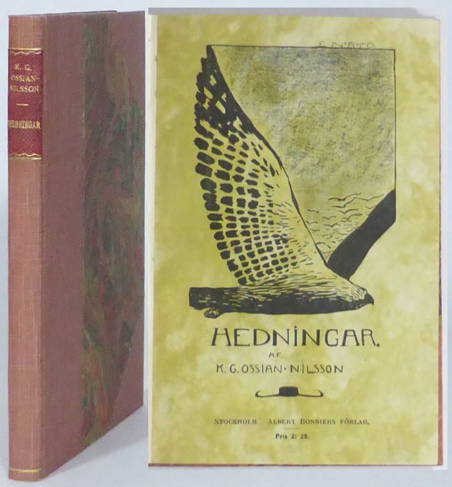 Stockholm; Bonniers, 1922. Originalupplaga. 19x13 cm. 115, (1 blank) s. Samtida grönt halvklotband (Hedberg) med ryggetikett I rött skinn, förgylld blomma på ryggen, marmorerade pärmpapper och snitt. Omslaget medbundet. Exlibris för Adolf och Louise Krusenstjerna samt namnteckning på halvtitelbladet (Mathilda Lagerbring). Ryggetiketten något nött. Fint ex. Innehåller även Hedbergs översättningar av Conrad Ferdinand Meyer, Theodor Storm, Vilhelm von Scholz och Leo Greiner.