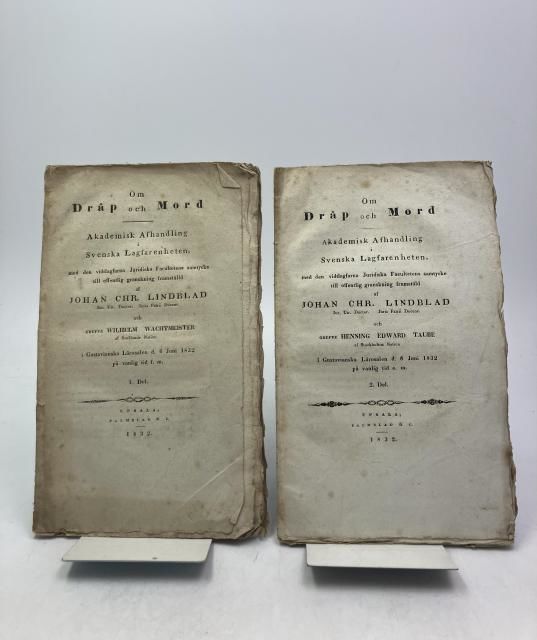 Upsala, Palmblad & C., 1832. Första upplagan. (2), 48; (2), 49-96 s. Häftade, oskurna och utan omslag, del 2 ouppskuren. Inlagorna ställvis något lagerfläckade samt med veck längs kanter och hörn, första arket i del 1 delvis loss. Första upplagan av denna avhandling vilken senare samma år utgavs i en utvidgad utgåva för bokhandeln. Lindblad, som sedermera blev professor i straffrätt i Uppsala, kom med denna avhandling att råka i häftig polemik med professor Carl Johan Schlyter, vilken även själv lät publicera inlagor i dispyten.
