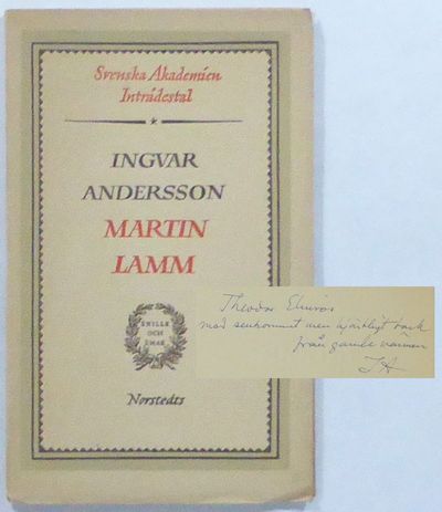 Stockholm; P.A Norstedt & Söner, 1950. (Svenska Akademiens inträdestal). 22x13,5 cm. 30 s. Häftad med tryckt omslag. Ouppskuren. Det överdimensionerade omslaget är aningen veckat vid hörnen. Med en dedikation till kriminologen ""Theodor Elmros / med senkommet men hjärtligt tack från gamle vännen / IA"".