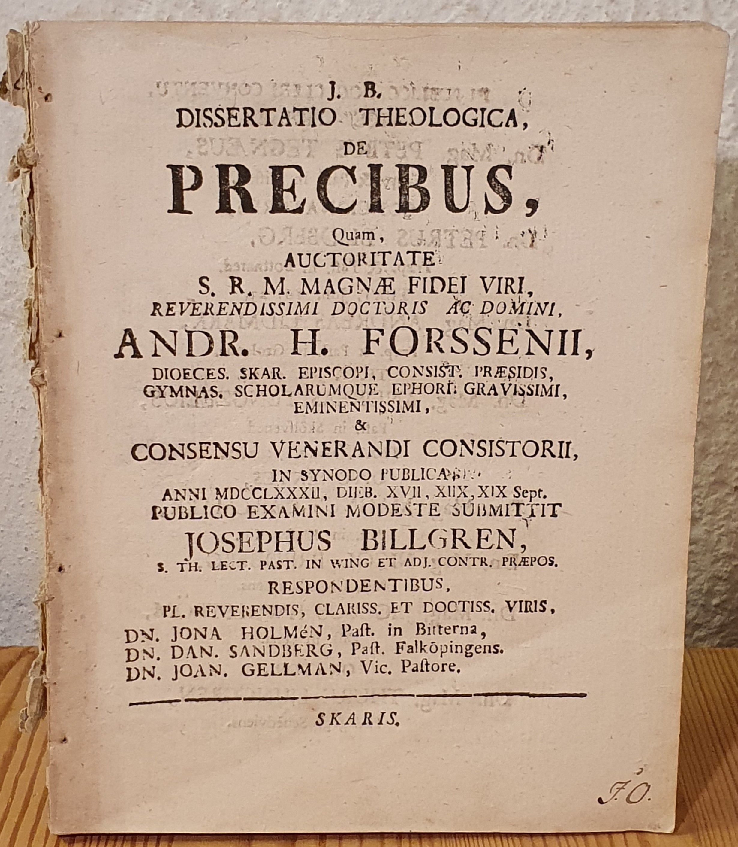 Quam auctoritate Andr. H. Forssenii (...) in synodo publica, anni mdcclxxxii dieb. xvii, xiix, xix sept. publico examini modeste submittit Josephus Billgren (...) respondenribus (...) viris dn. Jona Holmén, past. in Bitterna, dn. Dan. Sandberg, past. Falköpingens. dn. Joan. Gellman, vic. pastore. Skaris (Skara), [1783]. 4:o. (2),89,(1) s. Tagen ur band. Med en del gamla rättelser och tunna understrykningar med bläck i texten. Ägarnotering i bläck vid nedre hörn på titelbladet. Första arket delvis löst från bindingen. 19,5 x 15,5 cm.