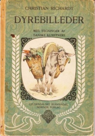 Dyrebilleder. Tekster til Tegninger af danske kunstnere. Heri diverse rim om dyr: Et romersk æsel, fårets klage, Tulte m.fl. Med en brunlig plet gennemgående forneden og svagt hjørneknæk