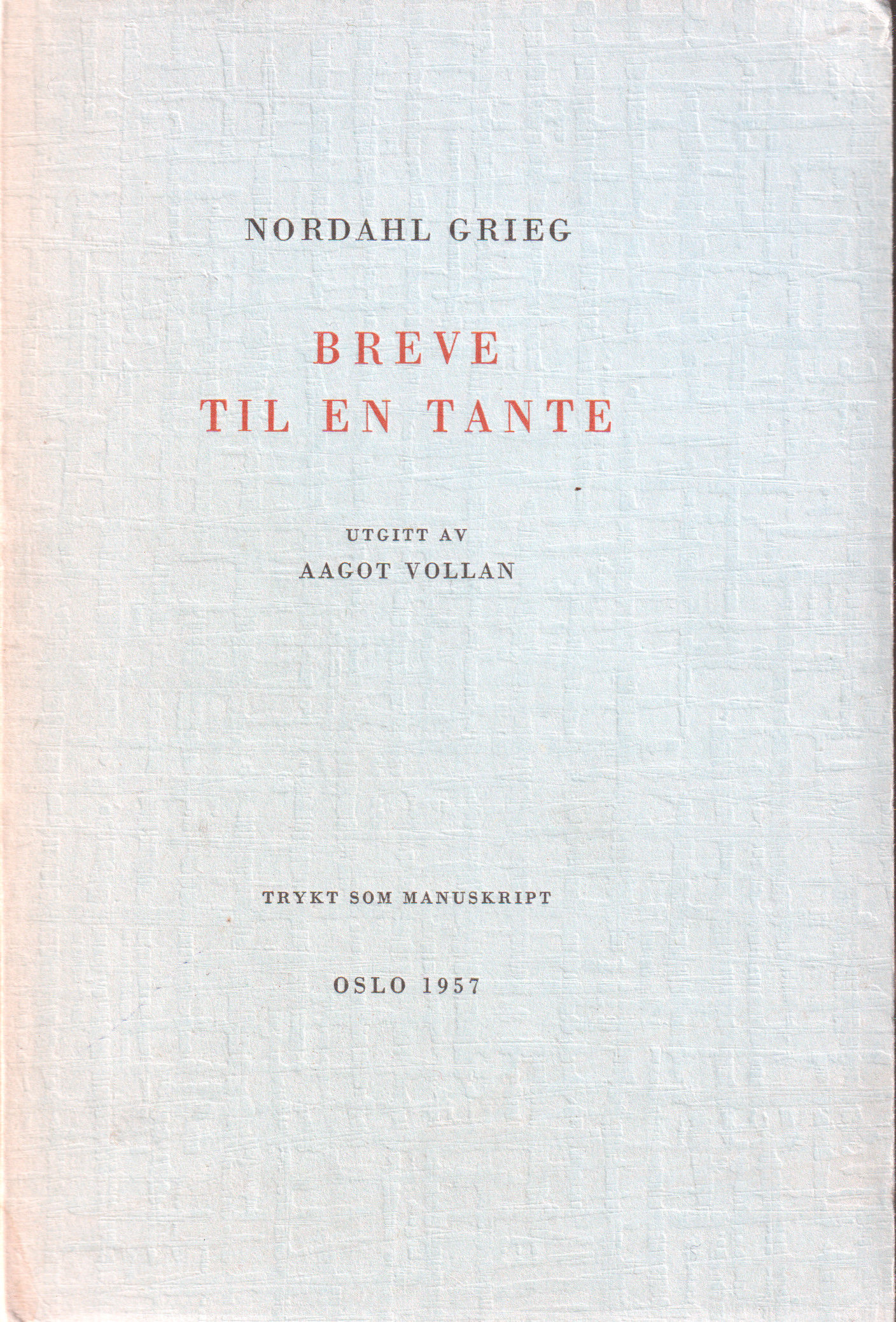 Brev fra Nordahl Grieg til sin tante i tiden 6/2-24 til mars 1940. Forord av Harald Grieg. Trykt som manuskript