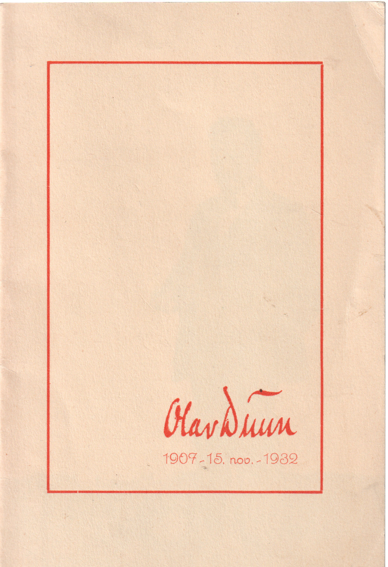 Olav Duun 25. år. 1907-15. nov.-1932. Hilsner av Sigrid Undset, Carl David Marcus, Knut Hamsun, Nini Roll Anker, Rolv Thesen, Francis Bull, Gunnar Gunnarsson, Halvdan Koht, Vetle Vislie, Jan Føyen, Charles Kent, Inge Debes, Harald Beyer, Einar Skavlan, Nils Collett Vogt, Kristian Elster, Arvid Mörne, Einar Breidsvoll, Hans Aanerud, A.H. Winsnes, Paul Gjesdal