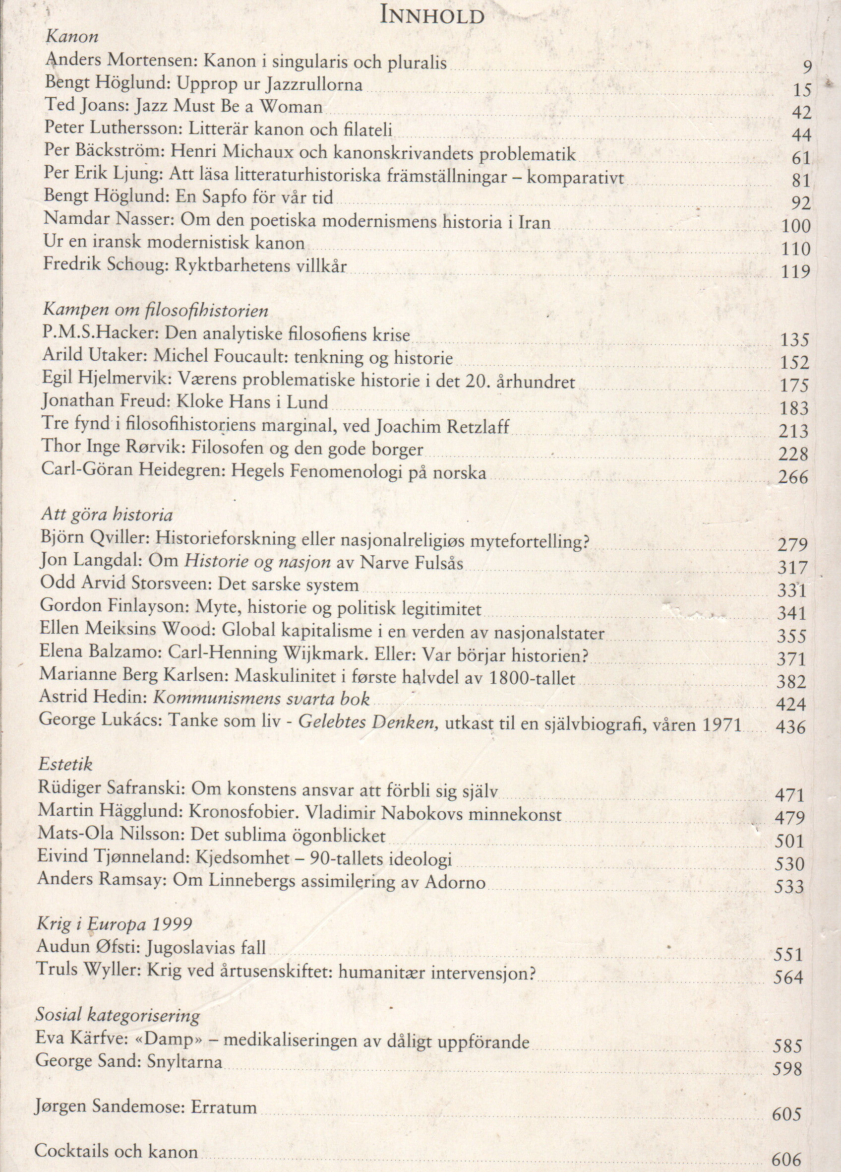 Boken er delt i områdene Kanon, Kampen om filosofihistorien, Att göra historia, Estetik, Krig i Europa 1999, Sosial kategorisering, Coctails och kanon