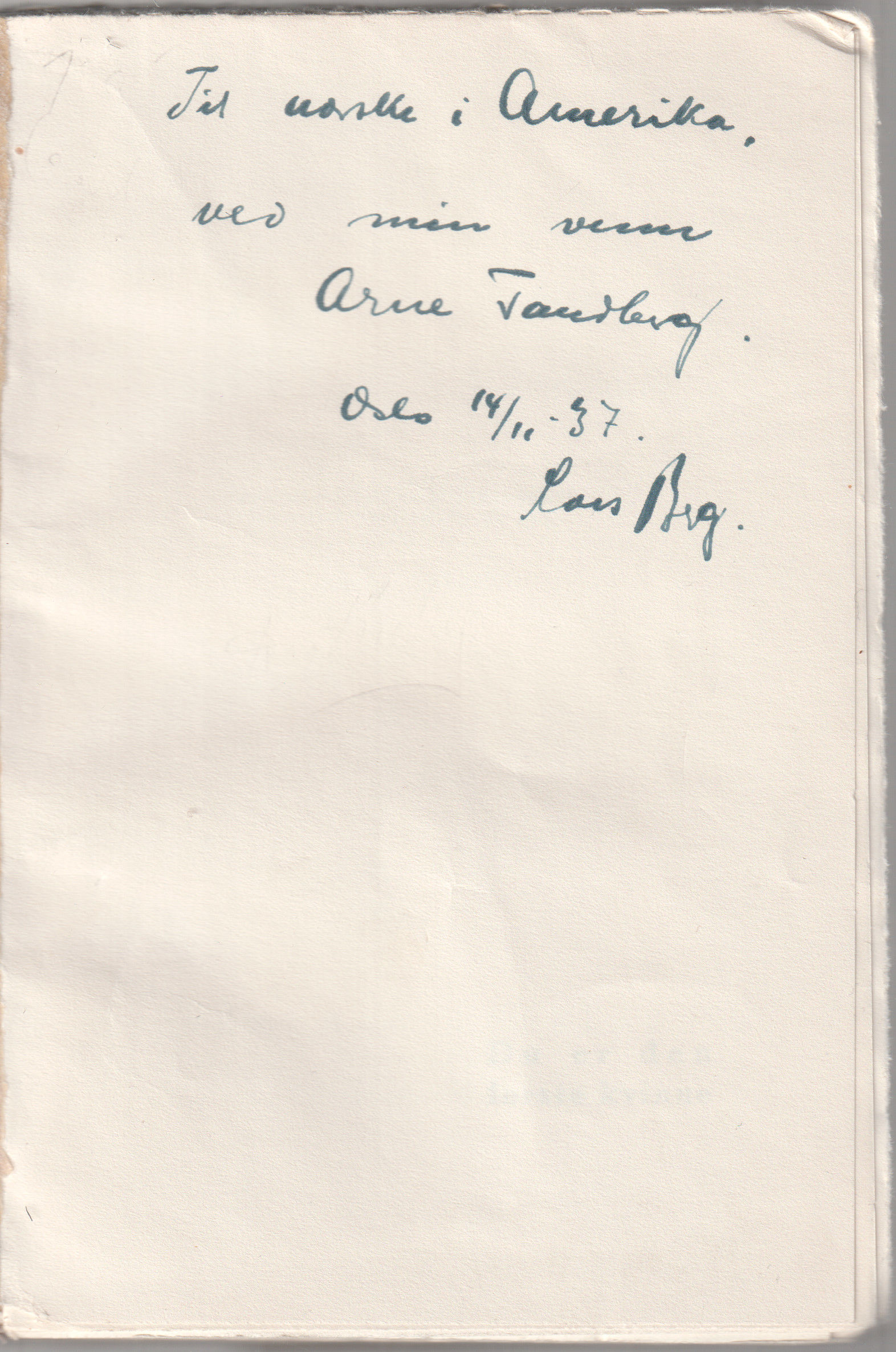Oslo, 1935. Orig.omslag. Pen. Andre opplag. Frisk og ren. Dedikasjonseksemplar signert av forfatteren. “Til norske i Amerika ved min venn Arne Tandberg. Oslo 14/10-27. Lars Berg”. Velholdt. (Tiden Norsk Forlag) 396 s. .
