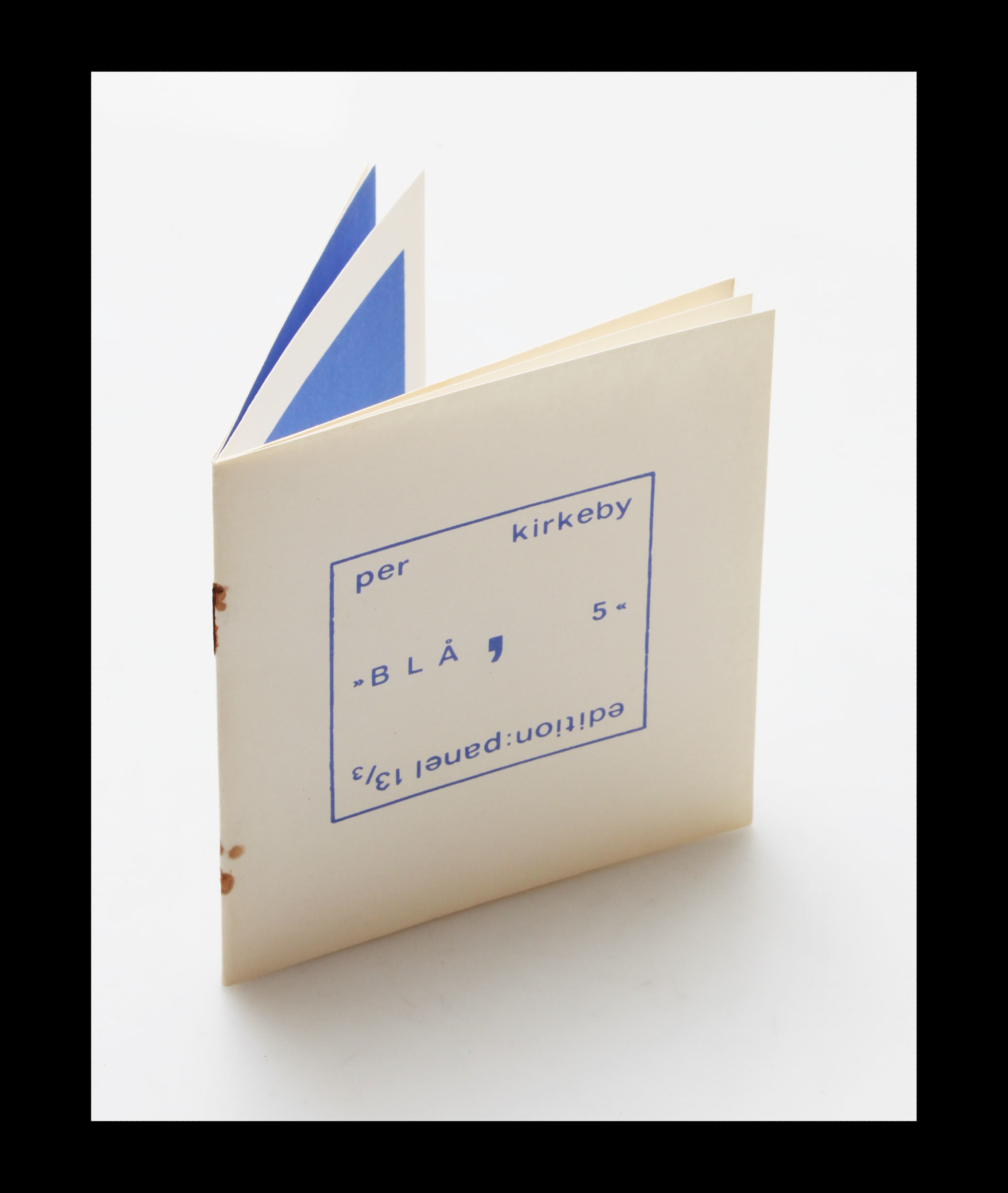 1. oplag. / Extremely rare artist book by Per Kirkeby. First printing. The rusty staples has left rust, going through the book - else good copy. Per Kirkeby’s first artist book, an artist book entirely printed in blue containing a text by Per Kirkeby and 5 illustrated tables with a square placed in the center of the page in a sequence that proceeds in the increasing order of size of the figures.