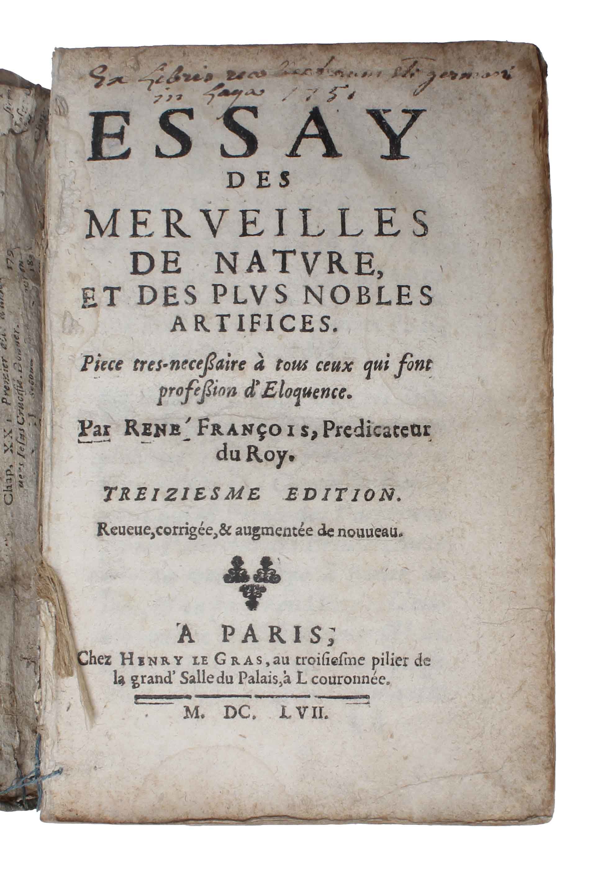 Essay des Merveilles de Nature, et des plus Nobles Artifices. Piece tres-necessaire à tous ceux qui sont profession d'Eloquence. Treiziesme Edition, Revueue, Corrigée, & augmentée de nouueau.