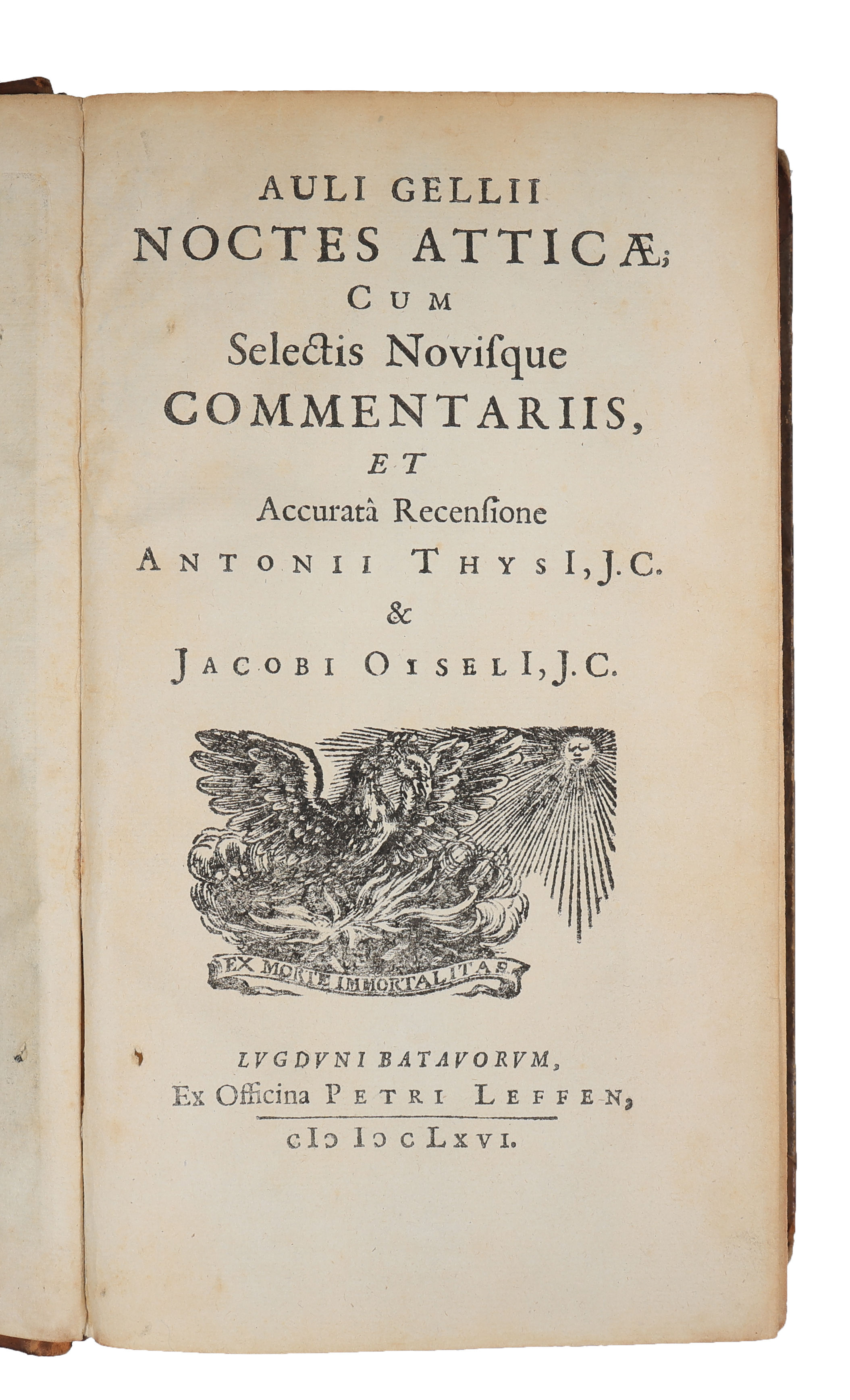 Noctes Atticæ; Cum Selectis Novisque Commentariis, etAccuratà Recensione Antonii Thysii, J.C. & Jacobi Oiselii, J.C. Lugd. Batavorum (Leiden), Petri Leffen, 1666.