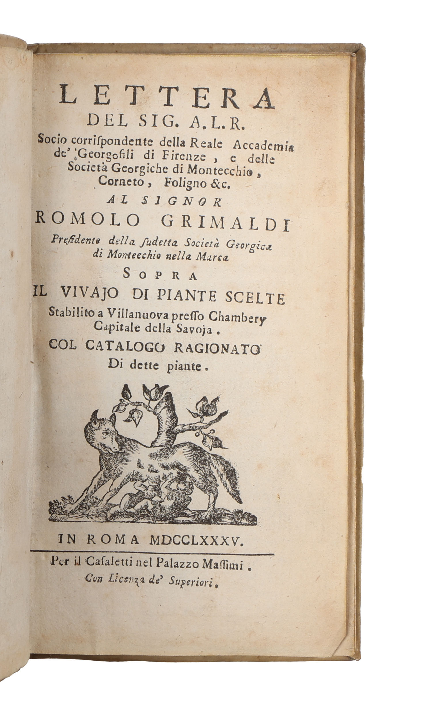 Lettera del Sign. A.L.R....al Signor Romolo Grimaldi...sopra il Vivajo di Piante Scelte. Stabilito a Villanouva presso Chamberry Capitale della Savoja. Col Catalogo Ragionato di dette piante.