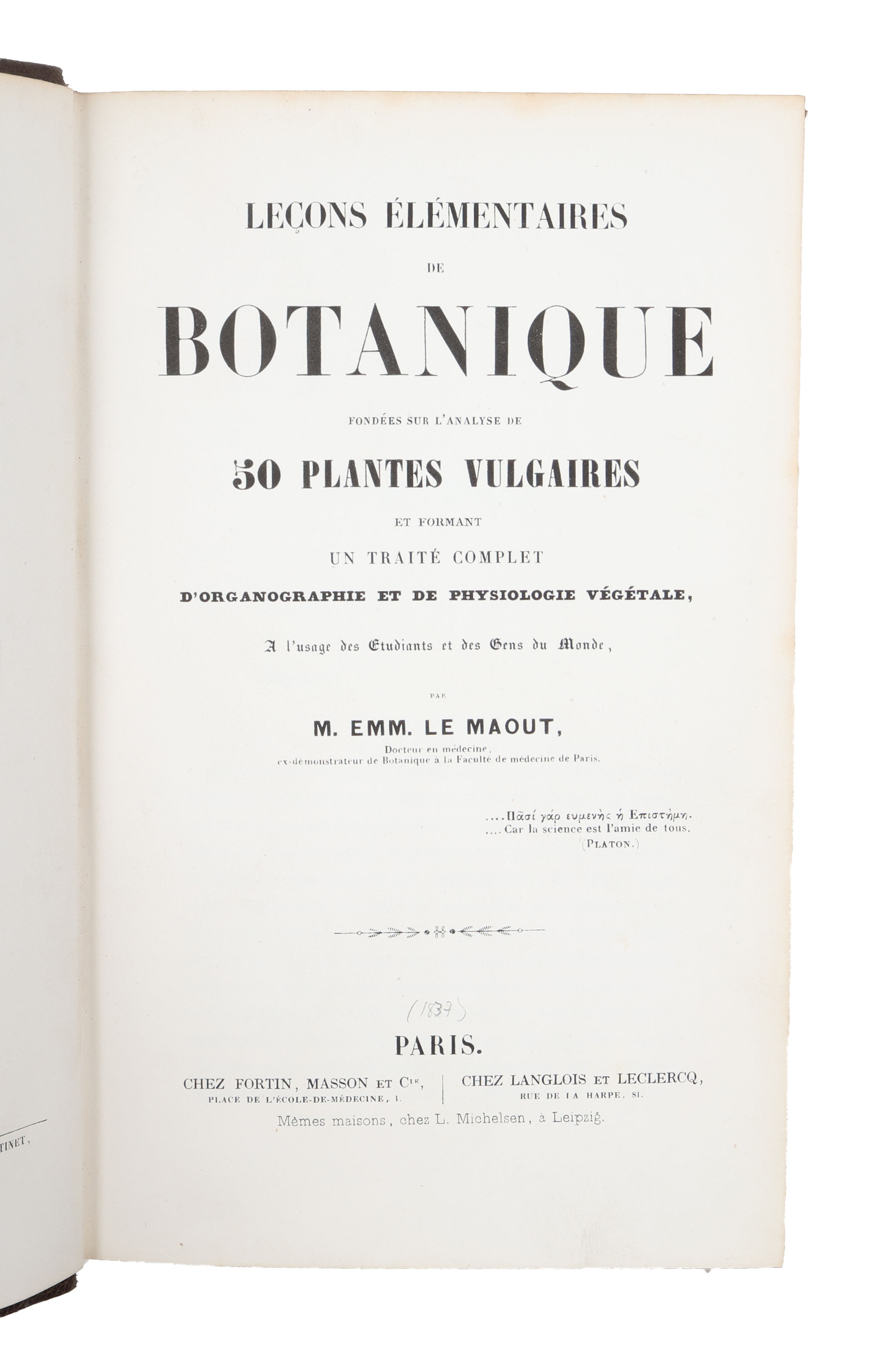 Lecons Élémentaires de Botanique fondées sur l'Analyse de 50 Plantes vulgaires et formant un Traité complet d'Organographie et de Physiologie Végétable. 1.-2. Partie + Atlas.(all).