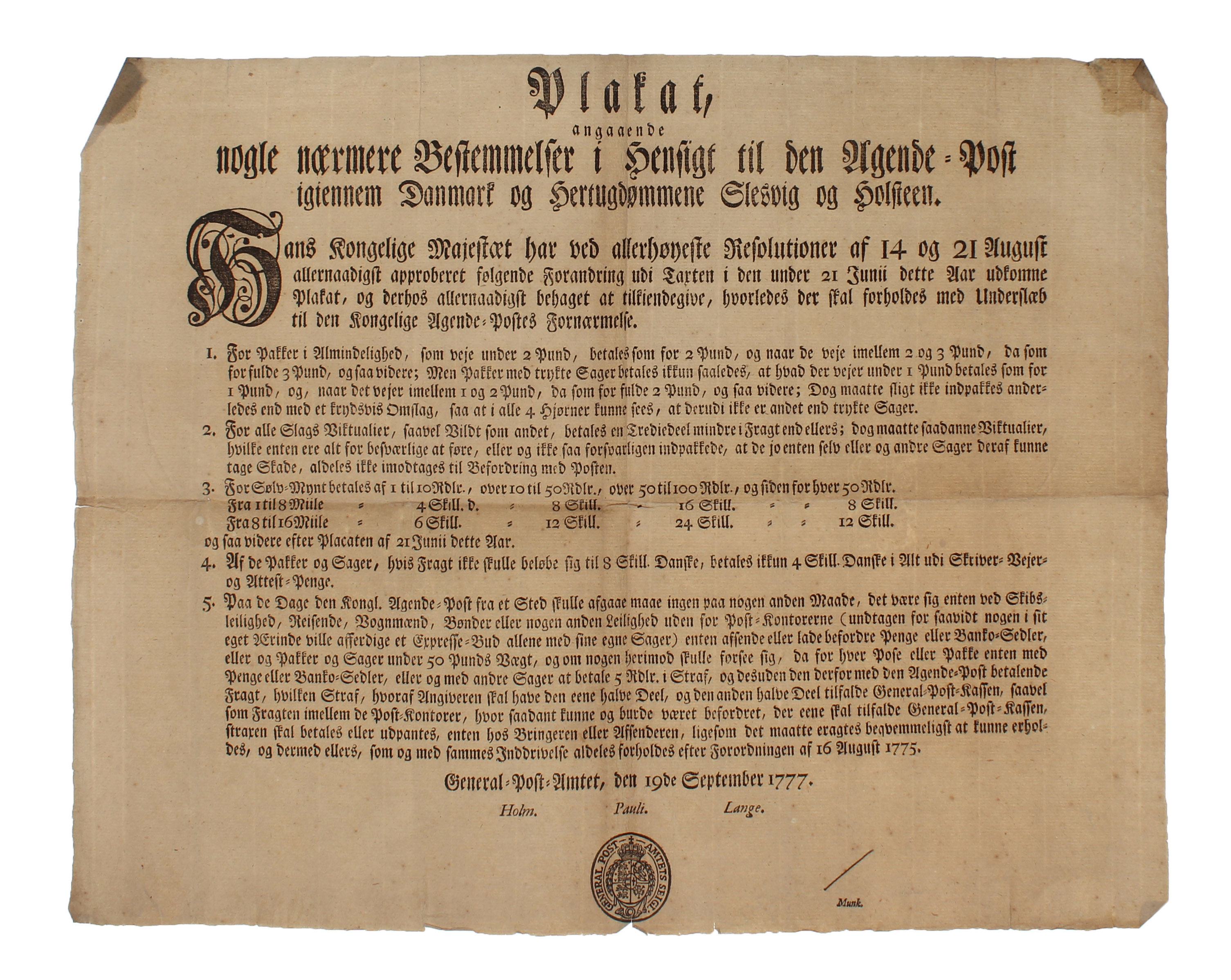 Plakat angaaende nogle nærmere Bestemmelser i Hensigt til den Agende=Post igiennem Danmark og Hertugdømmene Slesvig og Holsteen.