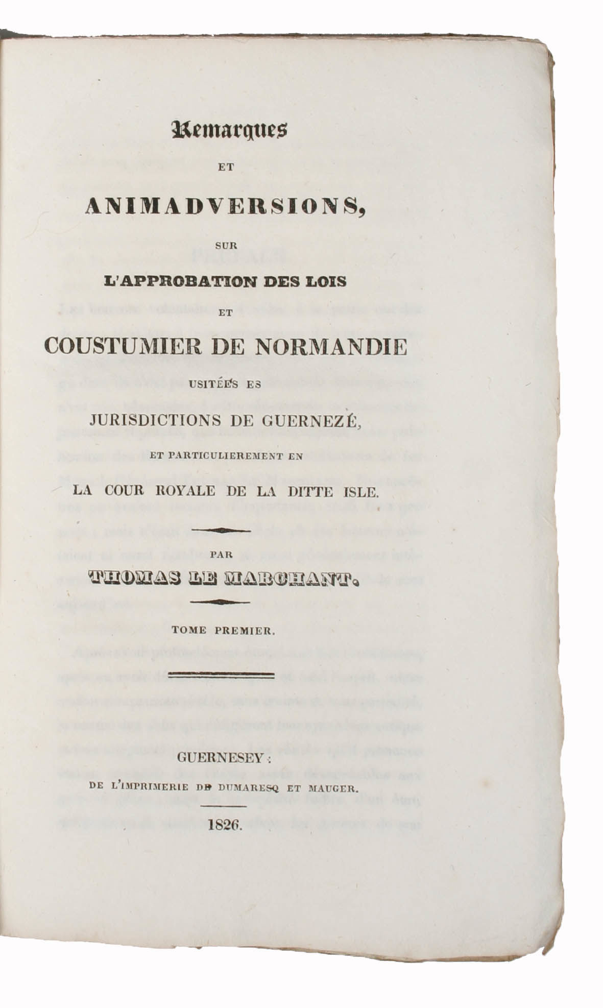 Remarques et Animadversions, sur L'Approbation des Lois et Coustumier de Normandie usitéés es juridictions de Guerneze, et Particulierement en La Cour Royale de la ditte Isle. Tome Premier (of 2).