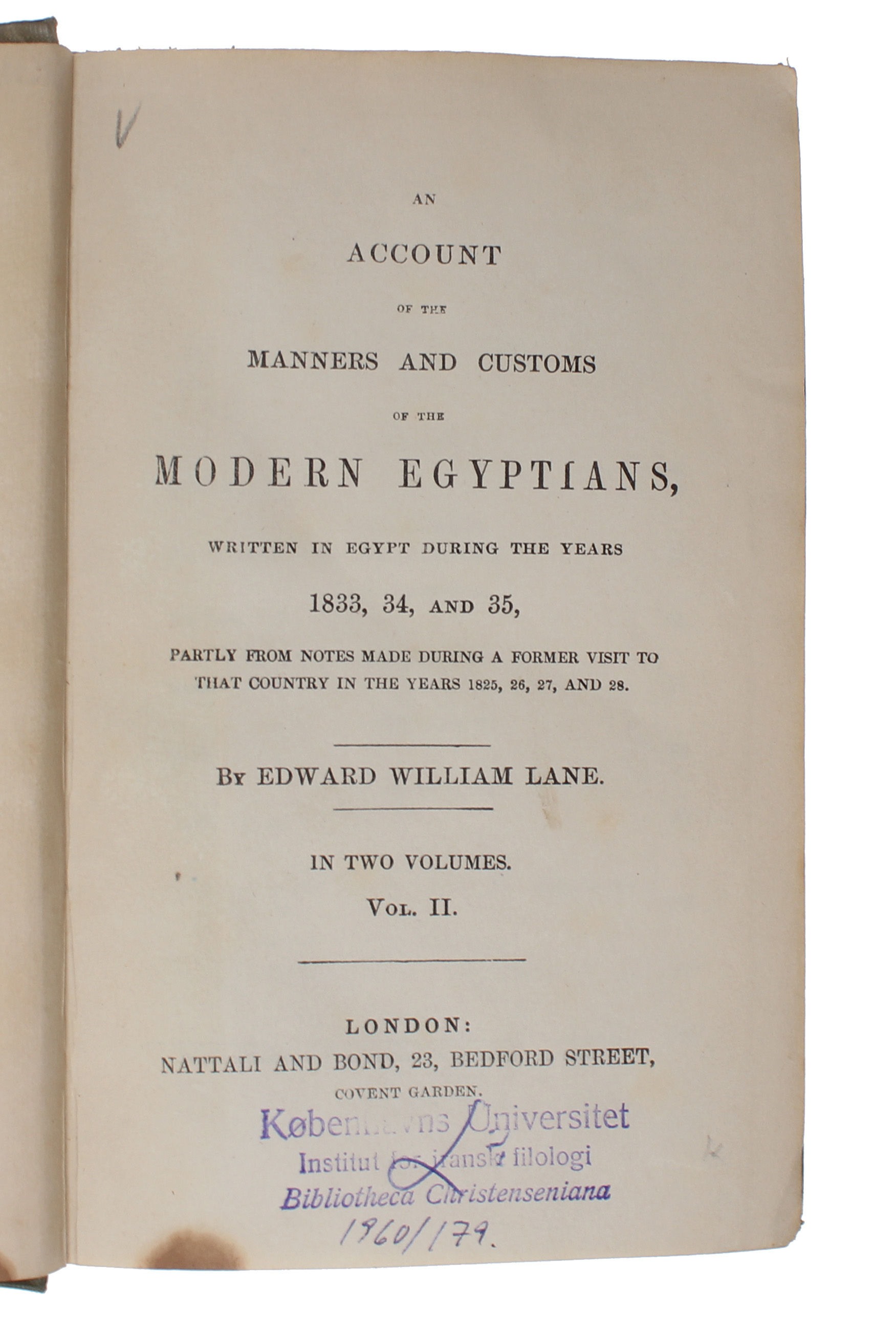 An Account of the Manners and Customs of the Modern Egyptians, written in Egypt during the Years 1833, 34 and 35. Partly from Notes made during a Former Visit to that Country in the Years 1825, 26, 27 and 28. 2 vols.