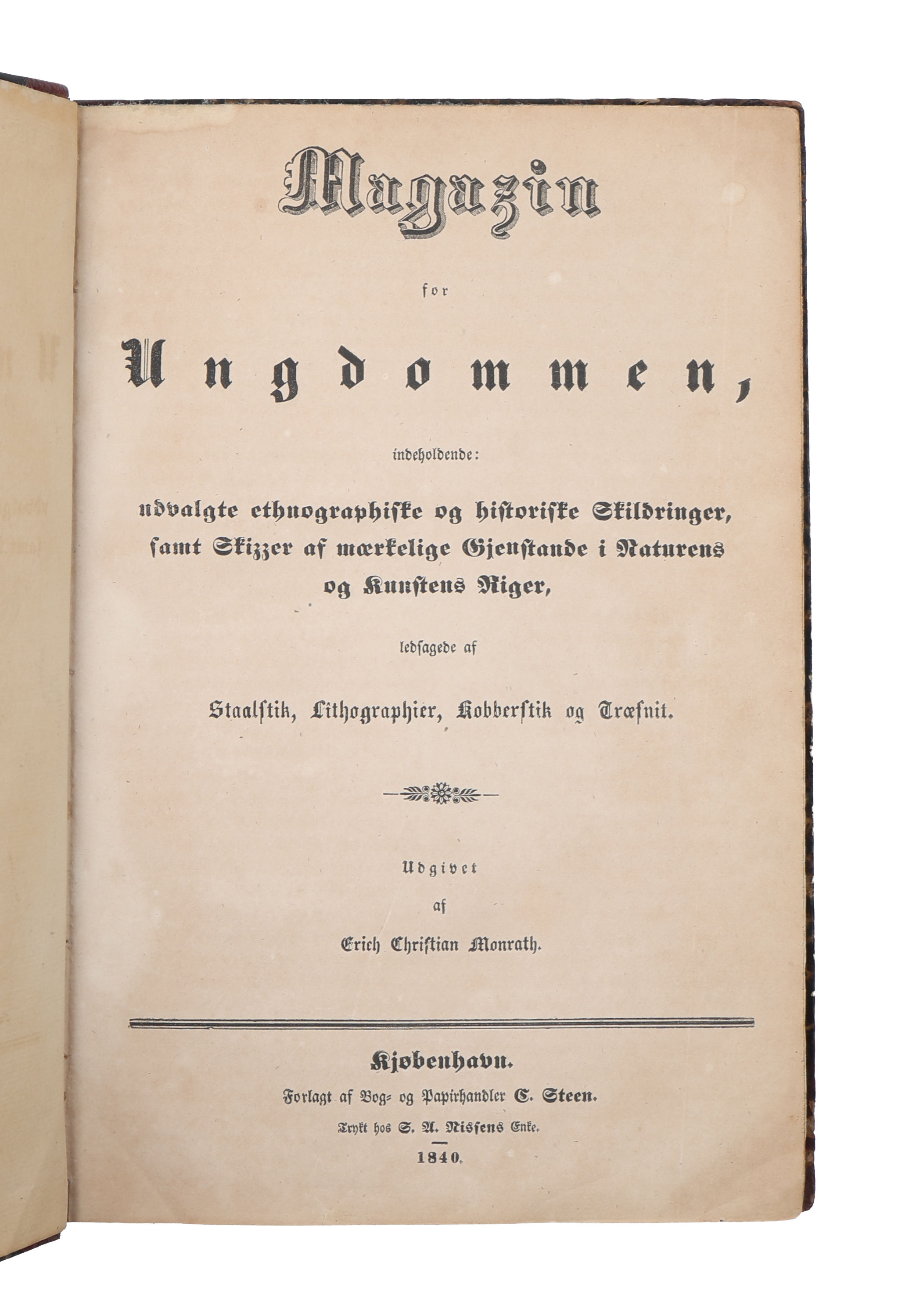 Magazin for Ungdommen, indeholdende udvalgte ethnographiske og historiske Skildringer, samt Skizzer og underlige Gjenstande i Naturens og Kunstens Riger, ledsagede af Stålstik, Lithographier, Kobberstik og Træsnit.