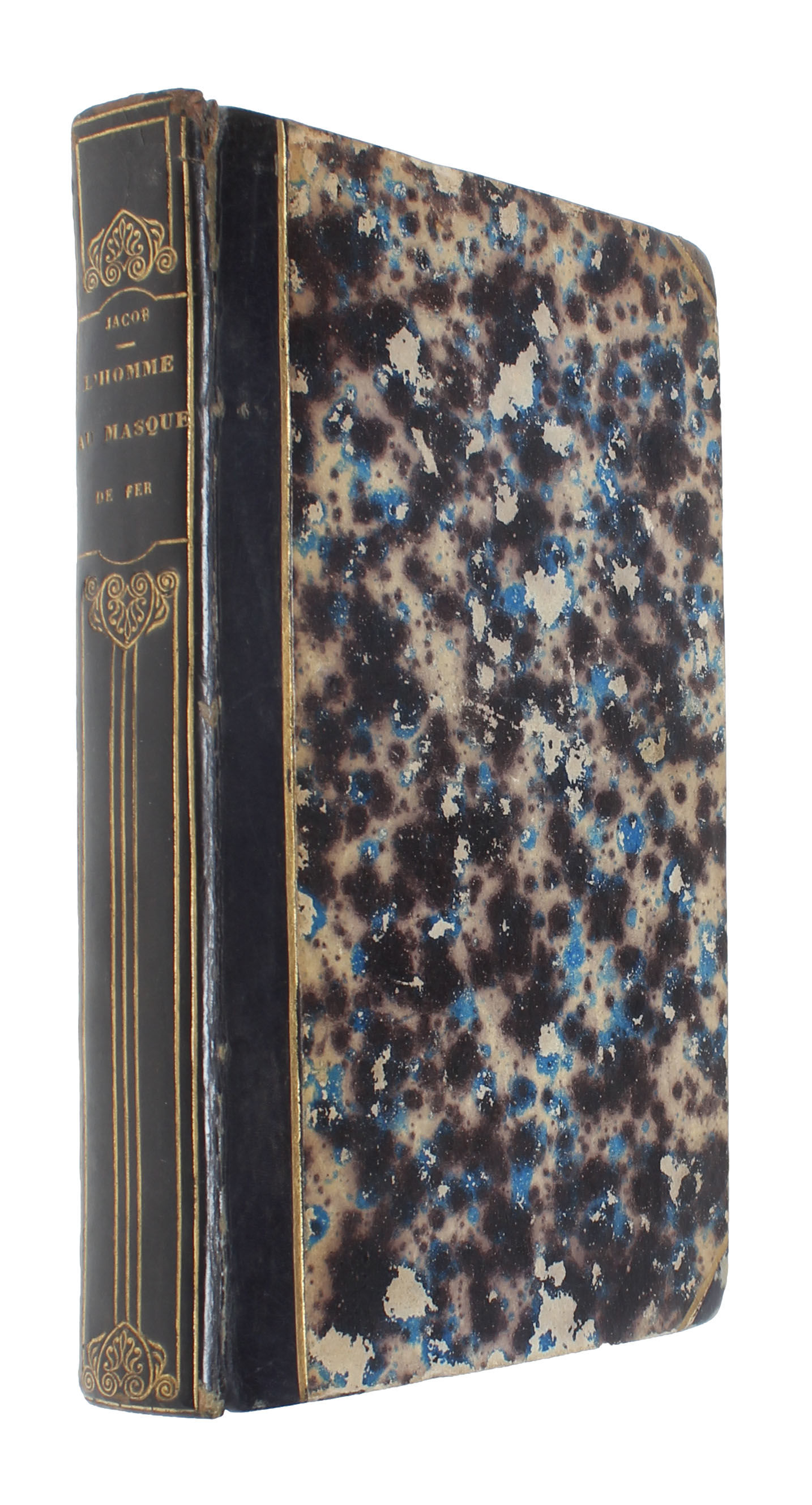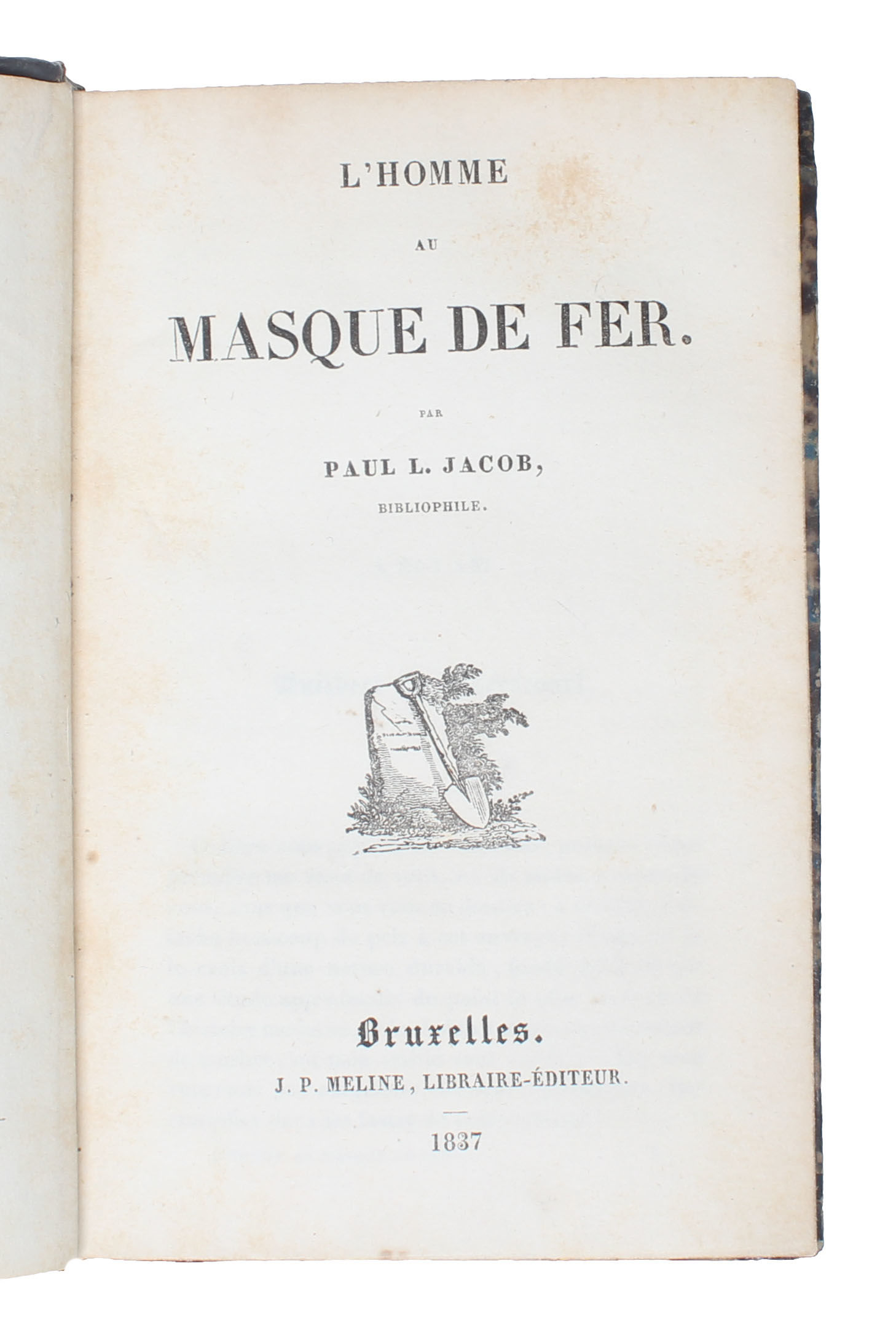 Rare edition of Lacroix's interesting book about the Man in the Iron Mask, which is a heavily discussed theme in French litterature. During the reign of Louis XIV, the mysterious man in the iron mask, the face of whom nobody saw, was kept prisoner in a number of jails, among these the Bastille, in the last half of the 17th century. According to Lacroix's theory, the Man in the Iron Mask was Nicolas Fouquet, who was imprisoned in Pignerol in 1665. Fouquet (1615-1680) was Viscount of Melon and Vaux, superintendant of finances to Louis XIV and protector of writers and artists, untill he fell in ill grace in 1661, was imprisoned and died under mysterious circumstances.Paul Lacroix (1807-1884) is renowned for his several important historical works and his numerous works of bibliographical contents, regarding which he can be said to have continued the tradition of Nodier. He wrote a number of historical novels, which were very popular at the time. They were reprinted numerous times, and were translated into several languages. Most of his works are published under pseudonym, because of which he is now best known under the name of "Bibliophile Jacob". Aged 28 he was awarded the cross of the "Légion d'Honneur" for his work on the history of the 16th century, and 1842 he founded "L'Alliance des Arts" together with M. Thoré. Apparently the first edition, which is quite scarce, appeared in Paris in 1836. Not in Carteret.