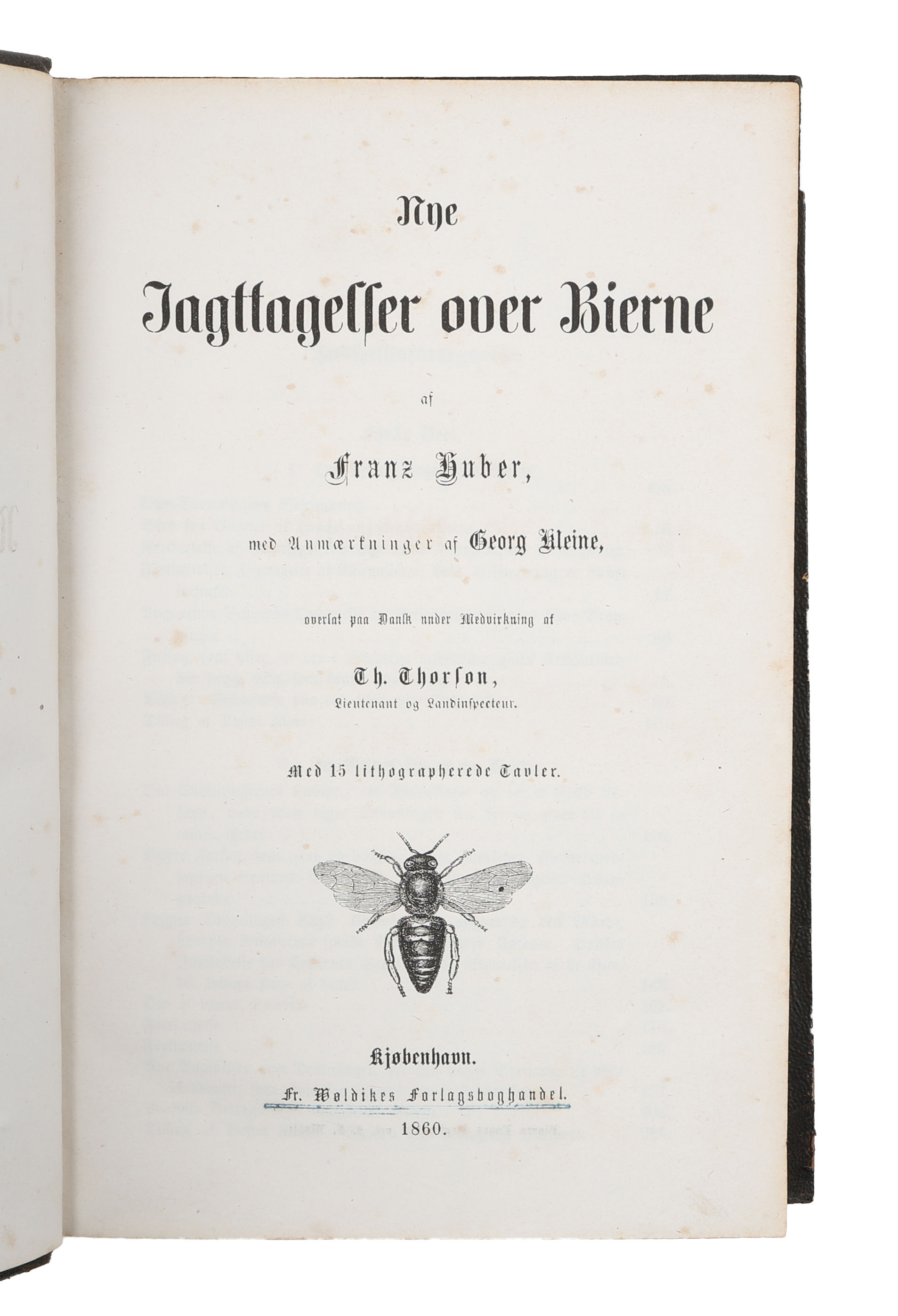 K., 1860. Samt.hldrbd. 528 pp. samt 15 litograf. tavler. Første danske udgave of denne klassiker om biernes biologi og avl.