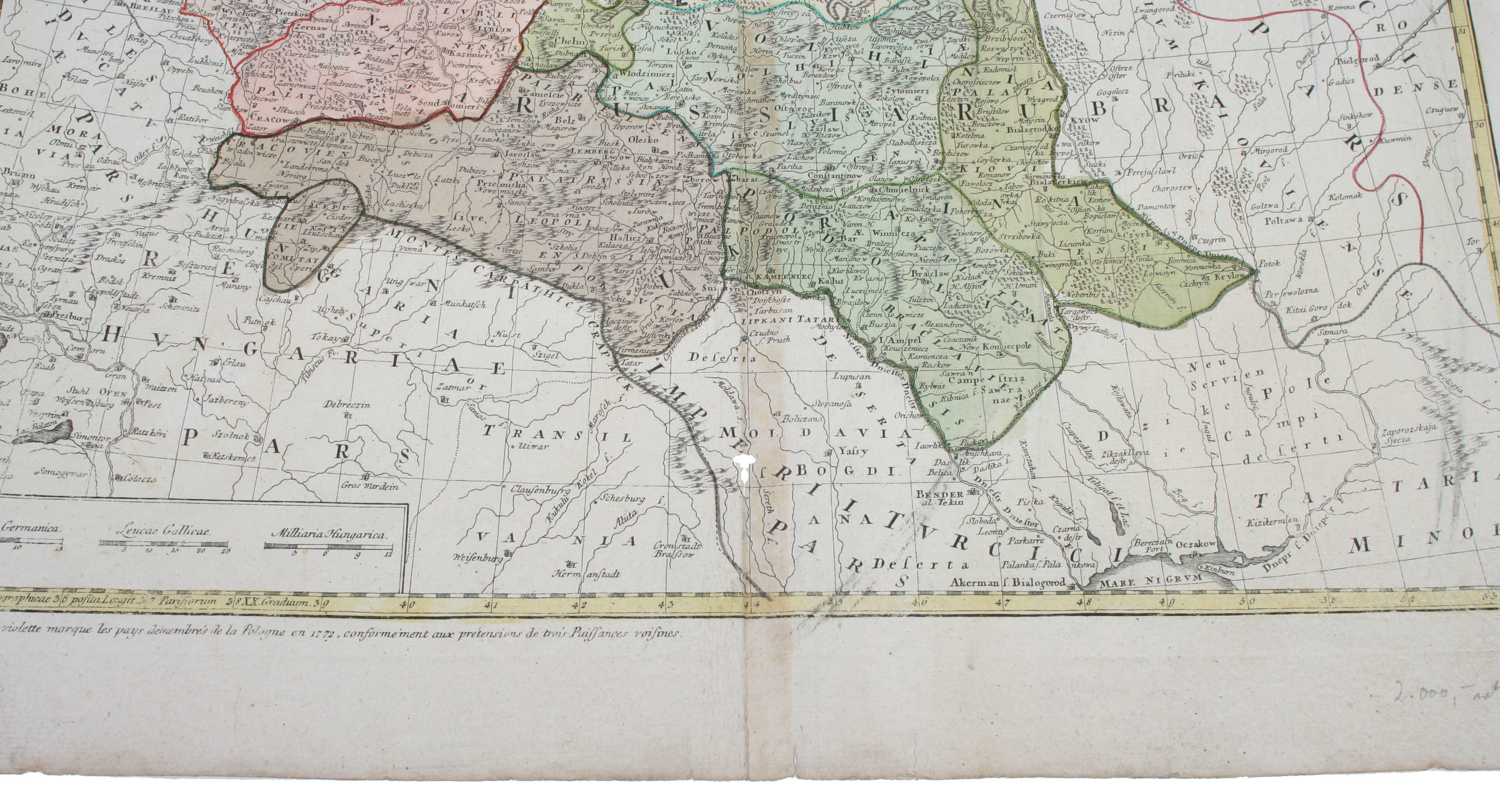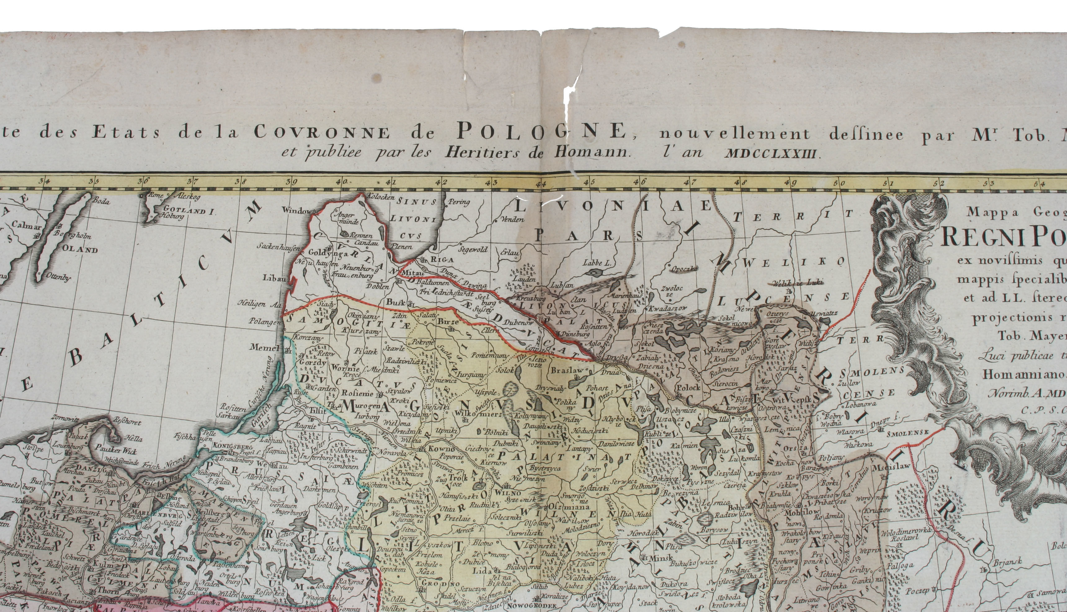 Nürnberg, Homannianos Heredes, 1773. 48,5x53,5 cm. Engraved and original hancoloured map of Poland and neighbouring areas. A tear in upper margin just touching the coloured image area. A very small hole in lower part of map in the folding.