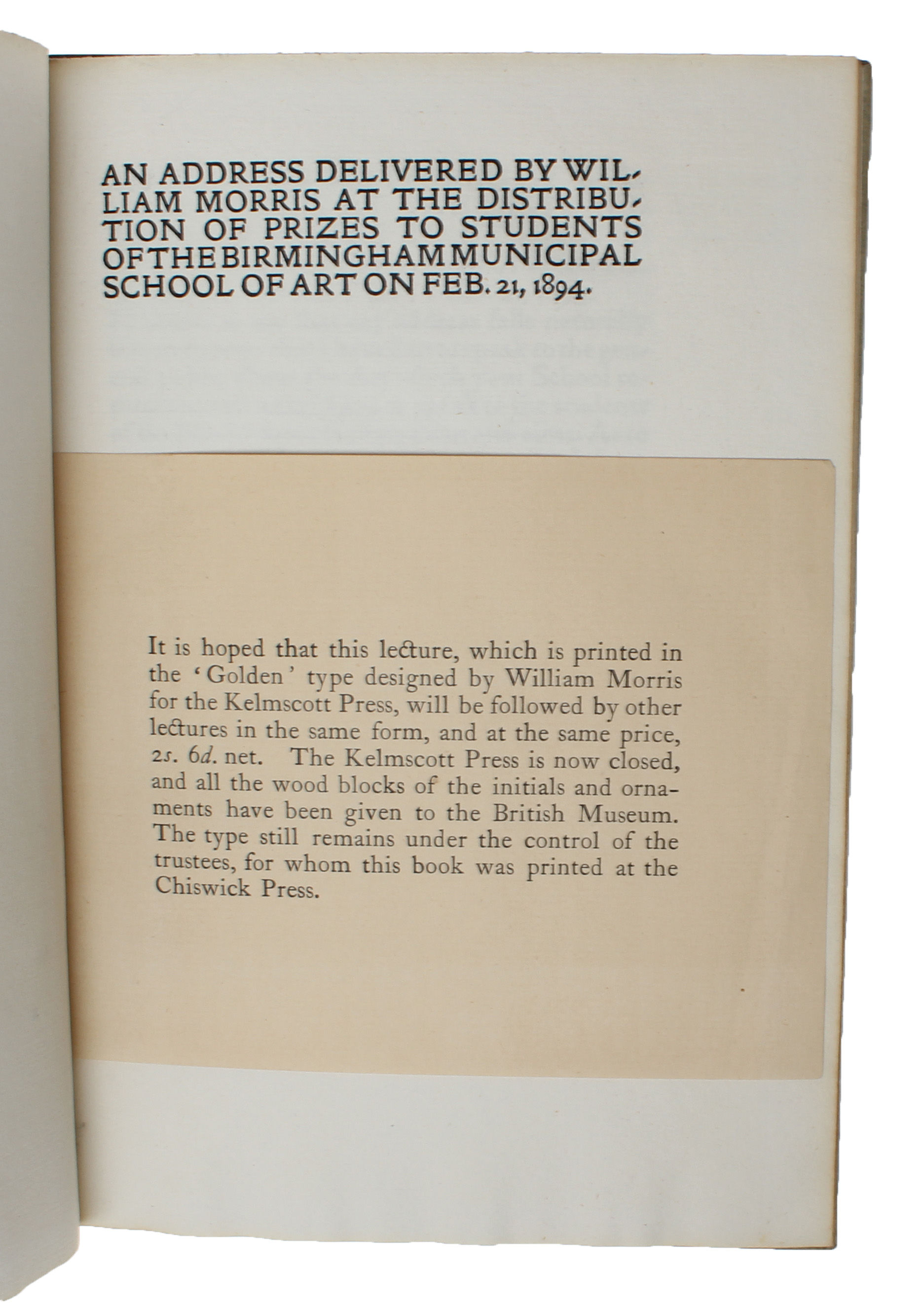 An Address delivered by William Morris at the Distribution of Prizes to Students of the Birmingham Muncipal School of Art on Feb. 21, 1894.