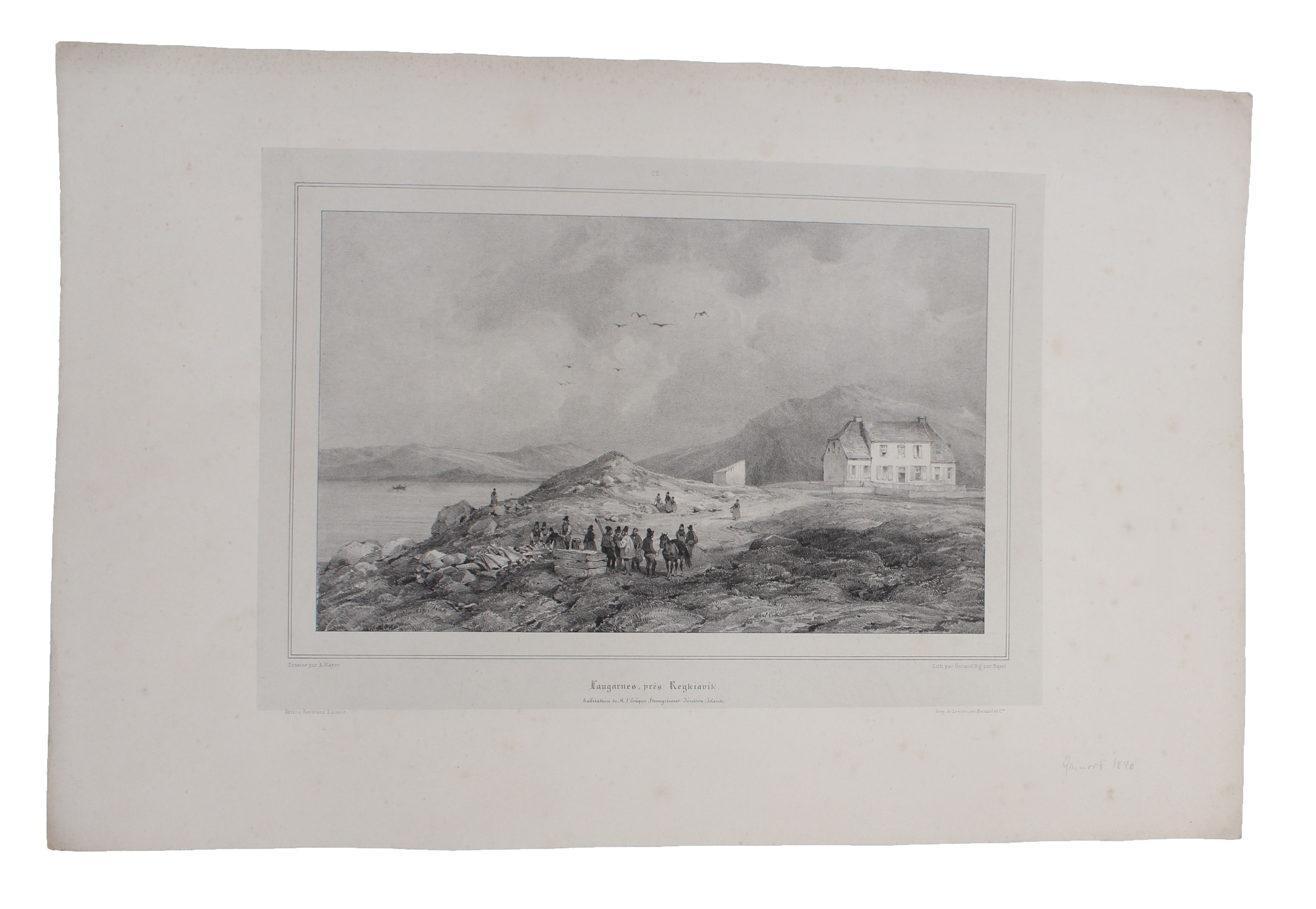 (Paris, Bertrand, ca. 1840). 25x 35 cm (billedflade). Originalt litografi trykt på kinapapir med brede marginer (Dessiné par A. Mayer). Prospekt af Laugarnes med folk og heste i forgrunden samt Jónssons bolig.