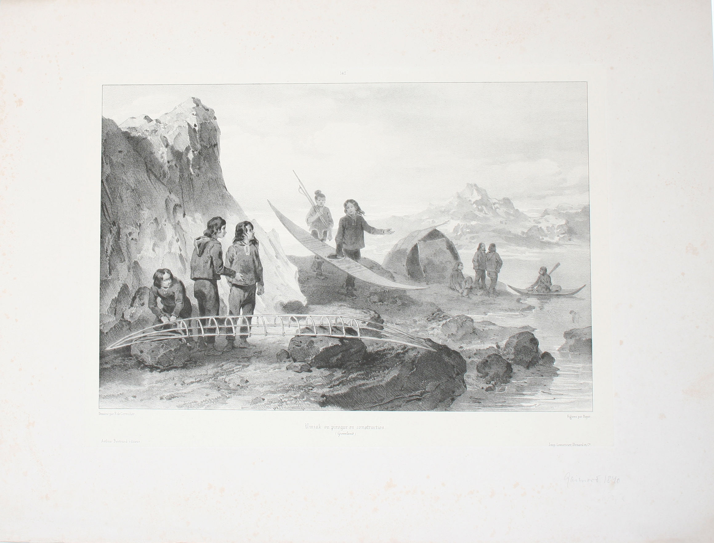 (Paris, Bertrand, ca. 1840). 24,5x34 cm.(billedflade). Originalt litografi trykt på kinapapir med brede marginer (Dessiné par R. de Cornulier). Fangerne befinder sig på nogle klippeskær hvorpå skindtelt og i forgrunden vises skelettet til en kajak under konstruktion.