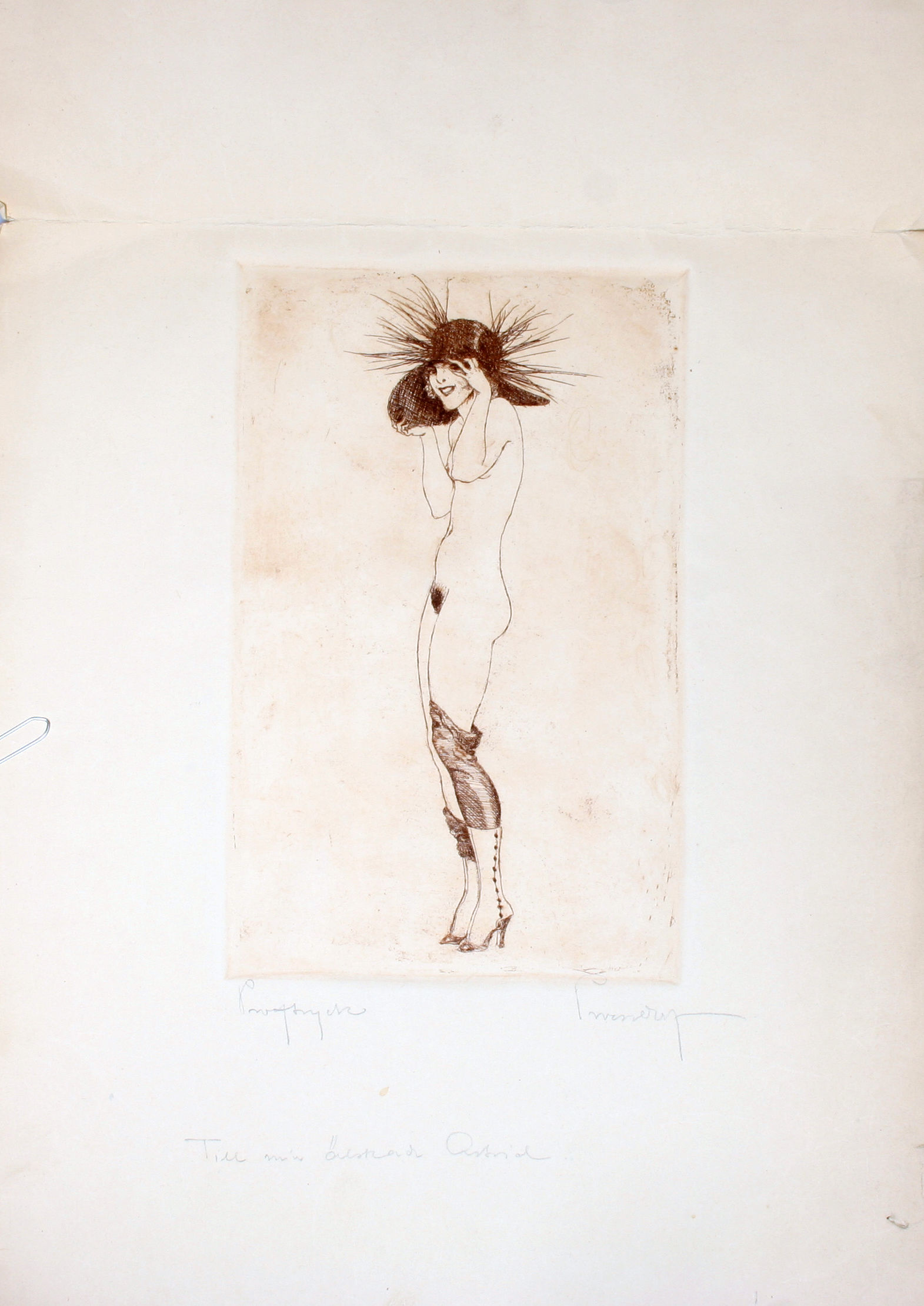 Ca. 1920. 23 x 14,5 cm. Signed in pencil, also with the word "privattryck" and "Till min älskade Astrid". Showing a nude girl wearing a straw hat, boots and stockings.