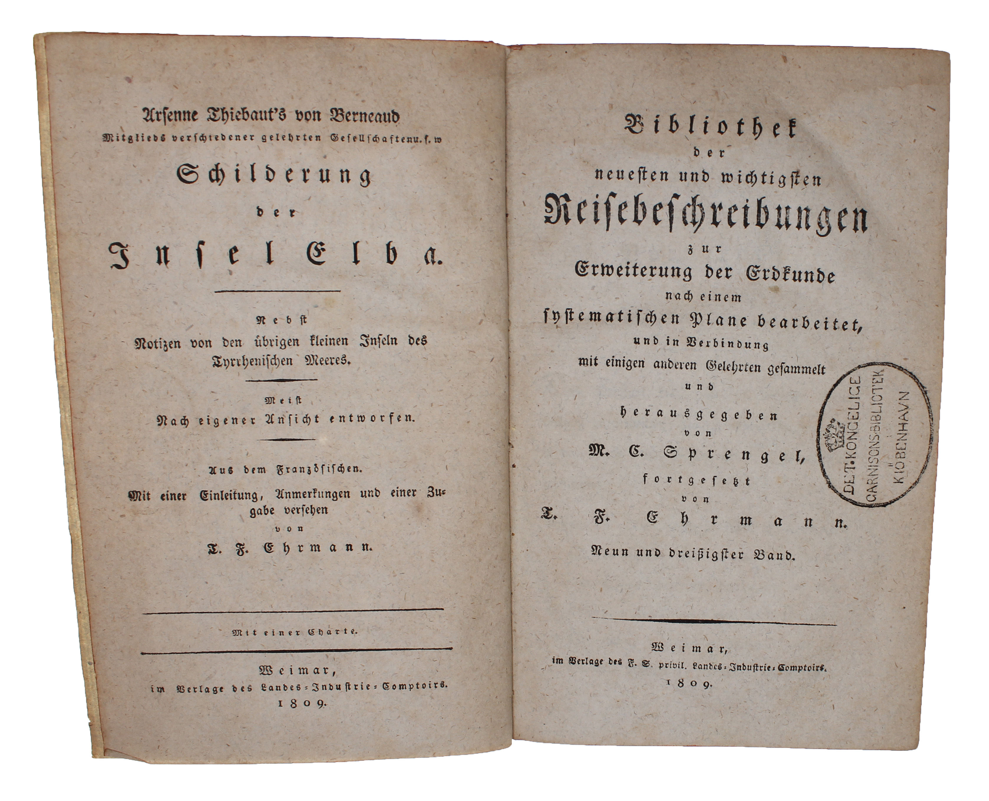 First German edition of "Voyage à l'Ille d'Elbe, suivi d'une notice sur les autres iles de la mer Tyrrhénienne...Paris, 1808". (Bibliothek der neuesten und wichtigsten Reisebeschreibungen...hrsg. von M.C. Sprengel, fortgesetzt von T.F. Ehrmann, 39. Bd.: 1. Theil). Also with the series titlepage, this with a stamp.