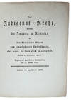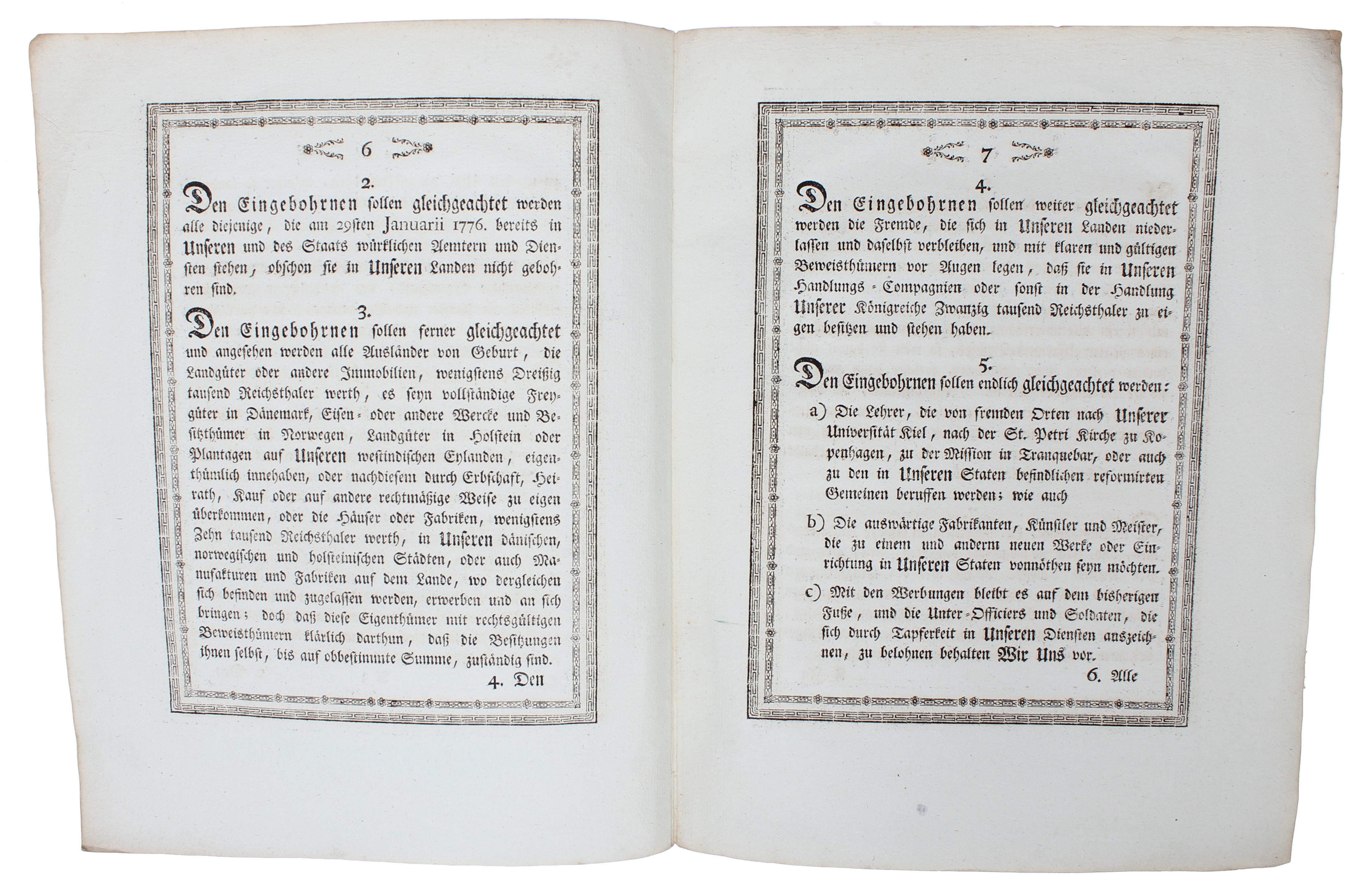 Det sjældne originaltryk af Indfødsretsloven i den tyske version (den danske og tyske udkom samtidigt). Loven blev udstedt af Christian VII, men var udformet afSchack Rathlau og Guldberg. Den blev udstedt uden om Statsrådet, og den havde til hensigt at stoppe for den uskik at landets embeder i urimeligt omfang blev besat af udlændinge, jvf. Struensee's tyske regimente. En betingelse skulle nu være at den pågældende var født i landet. - Bibl. Danica II:739.