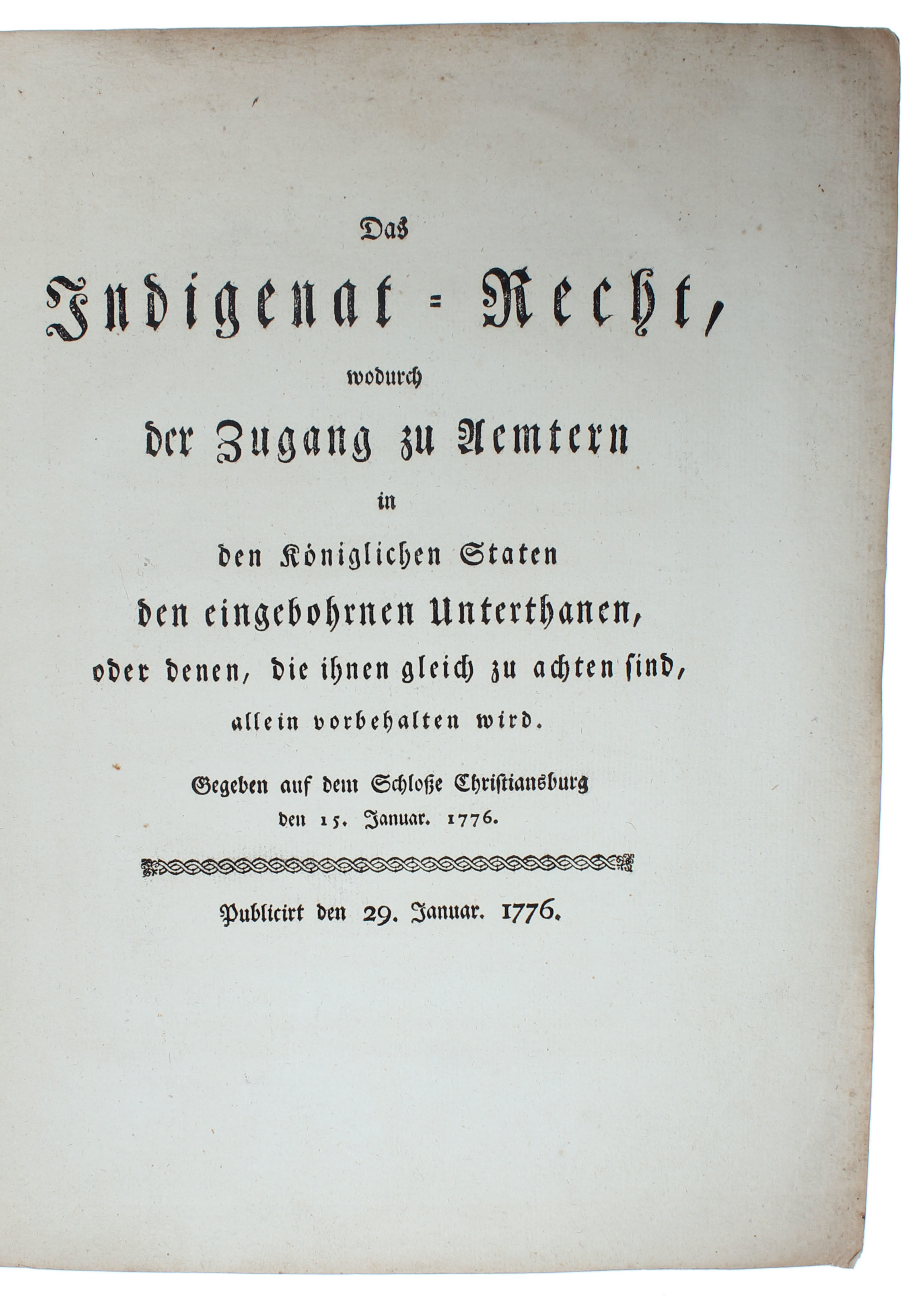 Das Indigenat=Recht, wodurch der Zugang zu Aemtern in den Königlichen Staten den eingebohrnen Unterthanen, oer denen, die ihnen gleich zu achten sind, allein vorbehalten wird. Gegeben auf dem Schlosse Christiansburg den 15. Januar. 1776.