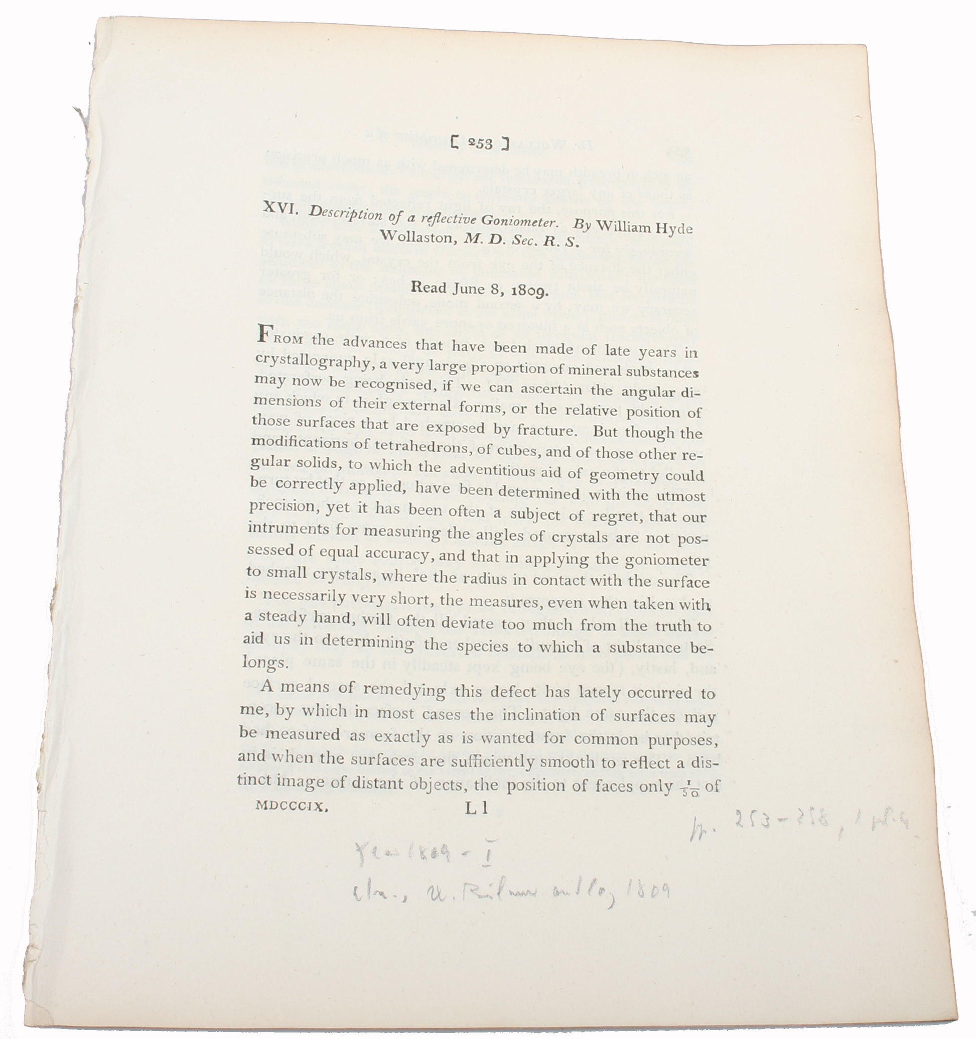 (London, W. Bulmer and Co., 1809). 4to. No wrappers as extracted from "Philosophical Transactions" 1809 - Part I. Pp. 253-258 and 1 engraved plate showing the Goniometer. Clean and fine.