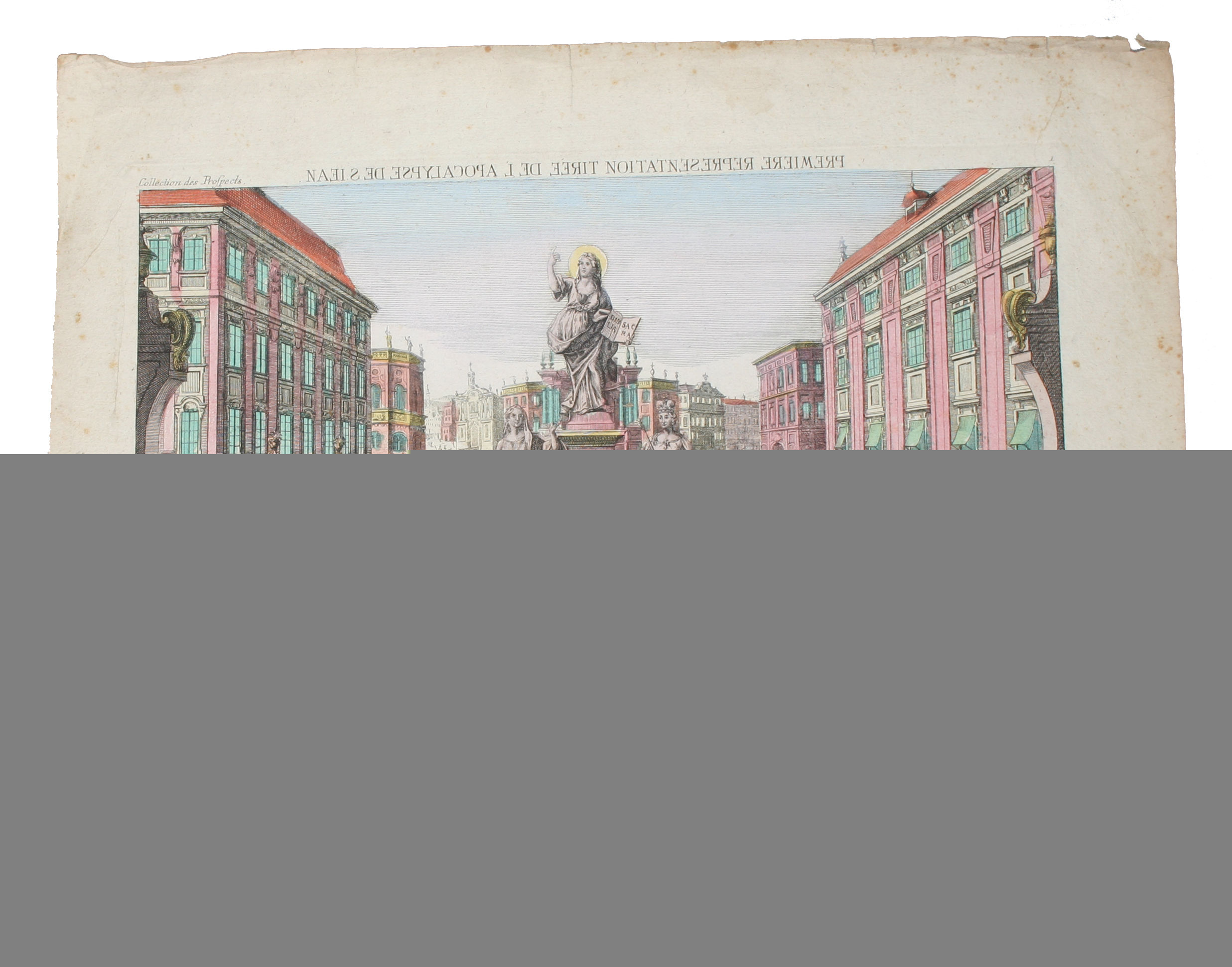 Ausbourg, (ca. 1770). Original hand colored copper engraving. Made for viewing in a zograscope (ge: guckkasten). Picture description below image in German and French. 30 x 40 cm.. An app. 4 cm. wide margin (not included in the 30 x 40 cm), is slightly frayed. Margins with brown spots.