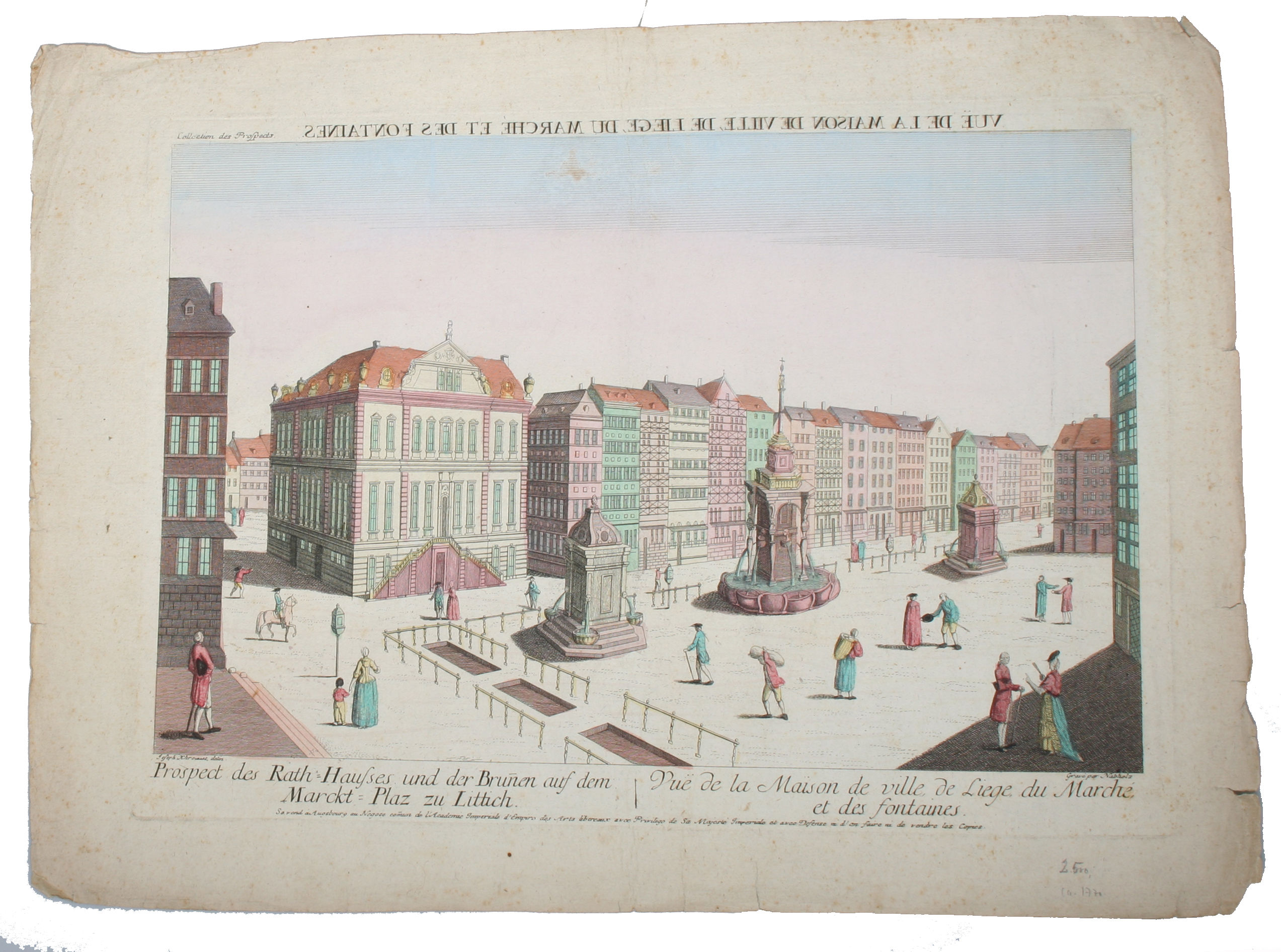 Vuë de la Maison de ville, de Liege, du Marche, et des fontaines / Prospect des Rath=Haufses und der Brunen auf dem Marckt=Plaz zu Littich