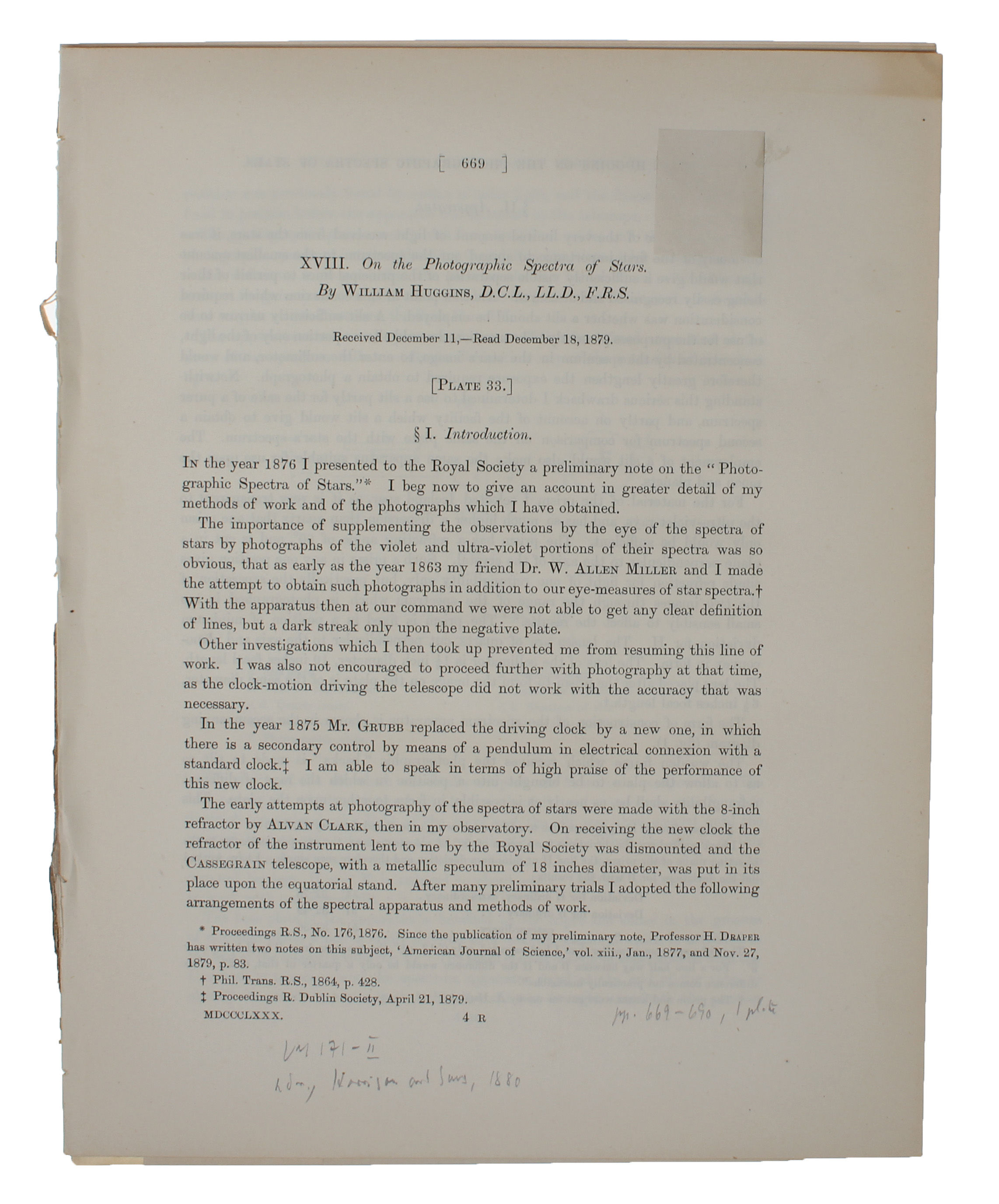 First printing of a pioneer work in the photography of star spectra."William Huggins (1824-1910), English astronomer, a pioneer in spectroscopy and photography. He examined spectroscopically the chemical constitution of stars and comets, and the gaseous nature of planetary and diffuse nebulae; he applied the Doppler Principle to the measurement of the radial velocities of stars, and published an atlas of representative stellar spectra" (Ripley: Source Book in Astronomy).