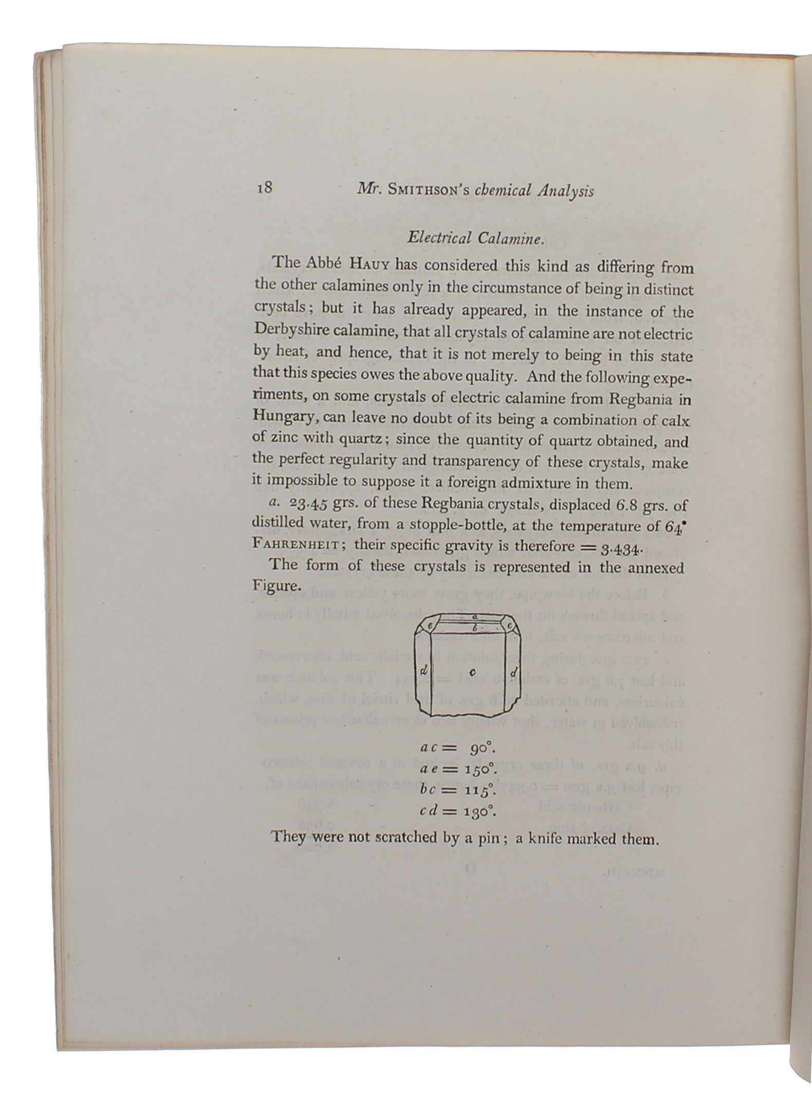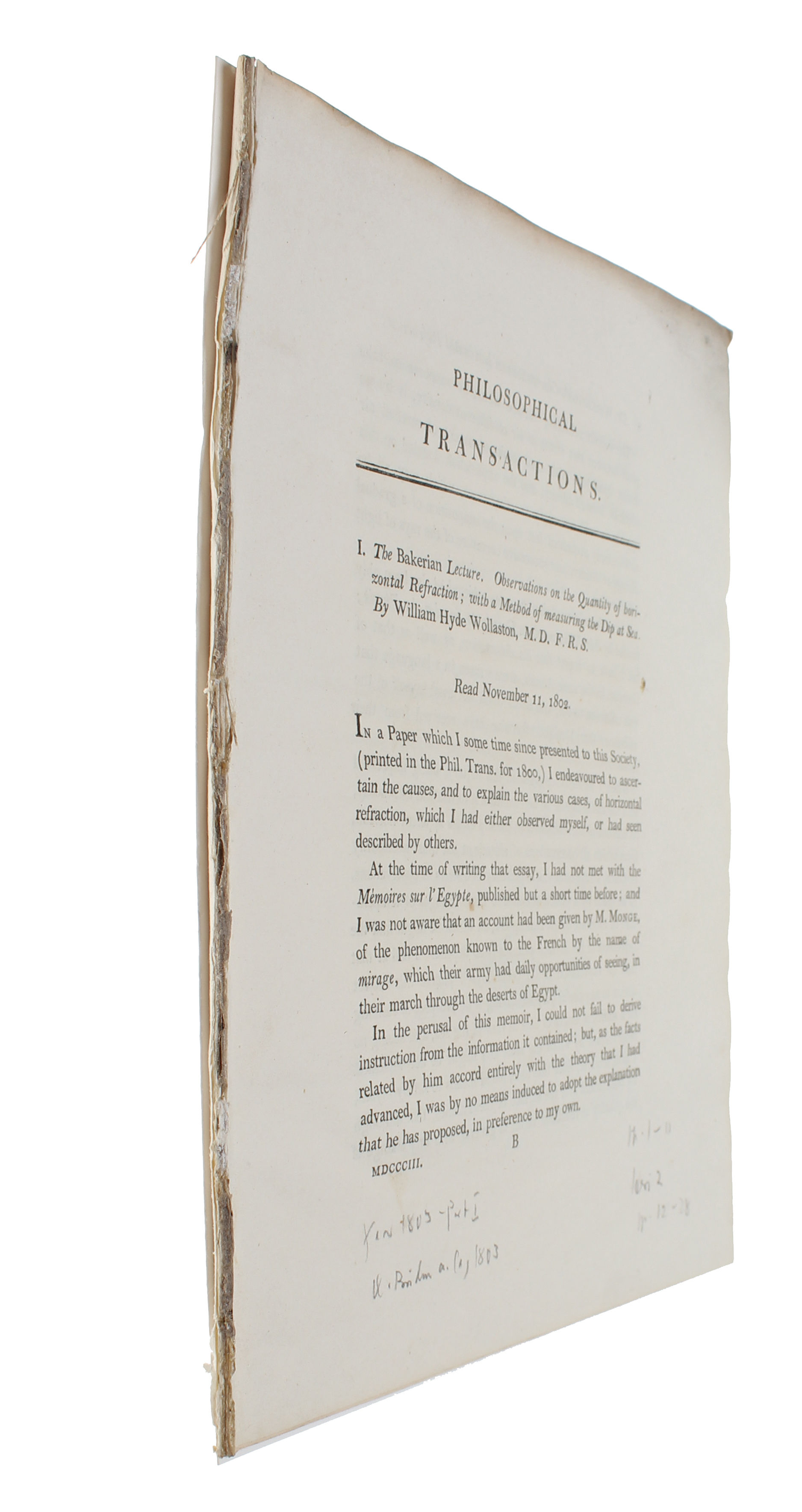 First printing of an importent paper in optical physics in which he investigates refraction phenomena over surfaces of water and in the atmosphere (mirage phenomena)., relating it to temperatures of air and land. He also announced his invention of the dip sector (modified sexton) that was used by Ross and Perry while exploring the arctic region.William Hyde Wollaston, (b. Aug. 6, 1766, d. Dec. 22, 1828), was an English chemist and physicist who discovered the elements palladium and rhodium and first reported the dark lines in the spectrum of the Sun. His consideration of geometrical arrangements of atoms led him into crystallography and the invention of the reflecting goniometer to measure angles of crystal faces. He also proved the elementary nature of niobium and titanium, developed a method of making platinum malleable, proved the identity of voltaic and frictional electricity, and invented the camera lucida to aid microscopists. The mineral Wollastonite was named in his honor. (Adventures in Cybersound).Another paper attached: James Smithson, "A chemical Analysis of some Calamines". Pp. 12-28.