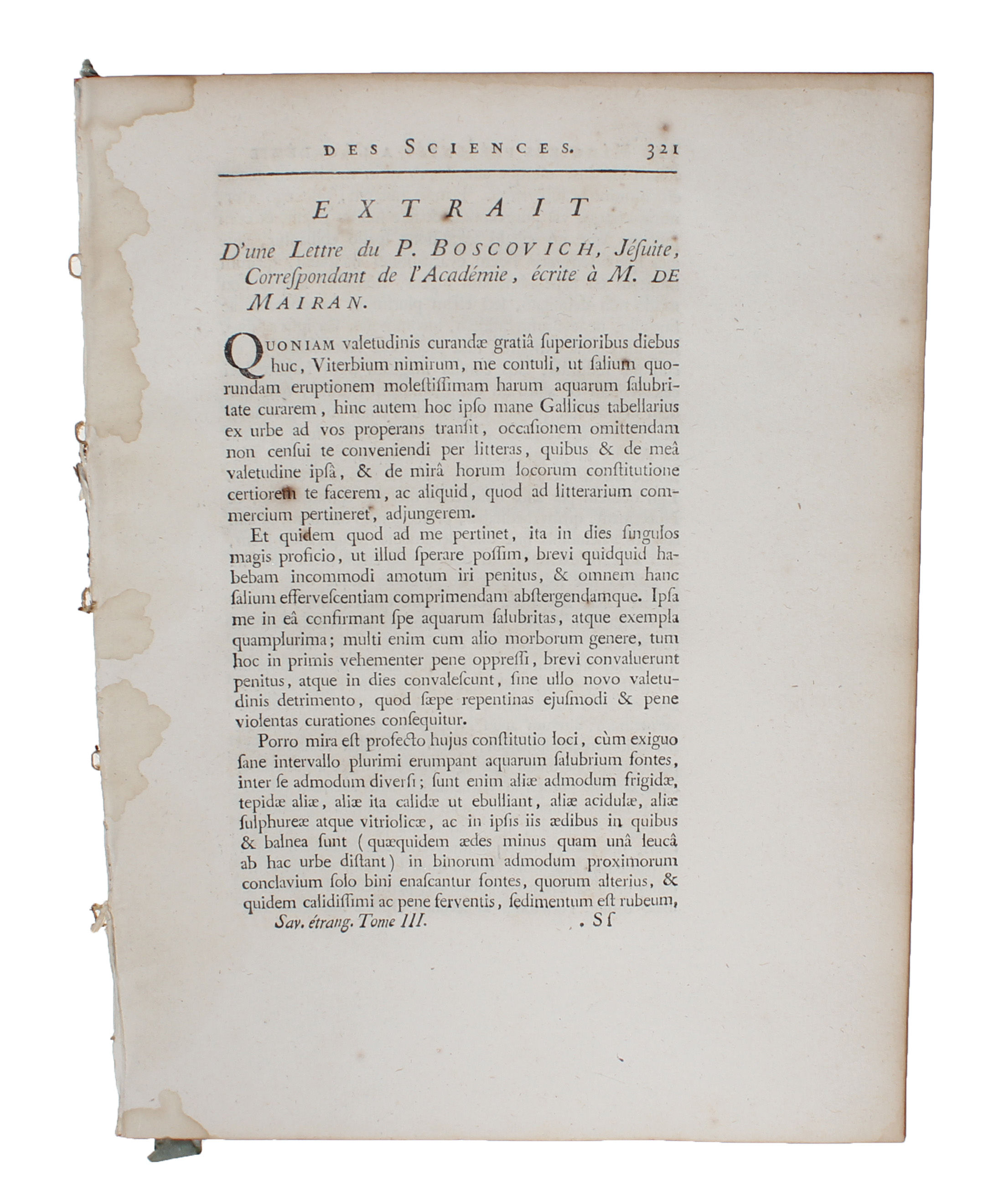 Extrait d'une Lettre du P. Boscovich, Jésuite, Correspondant de l'Academie, écrite à M. de Mairan.