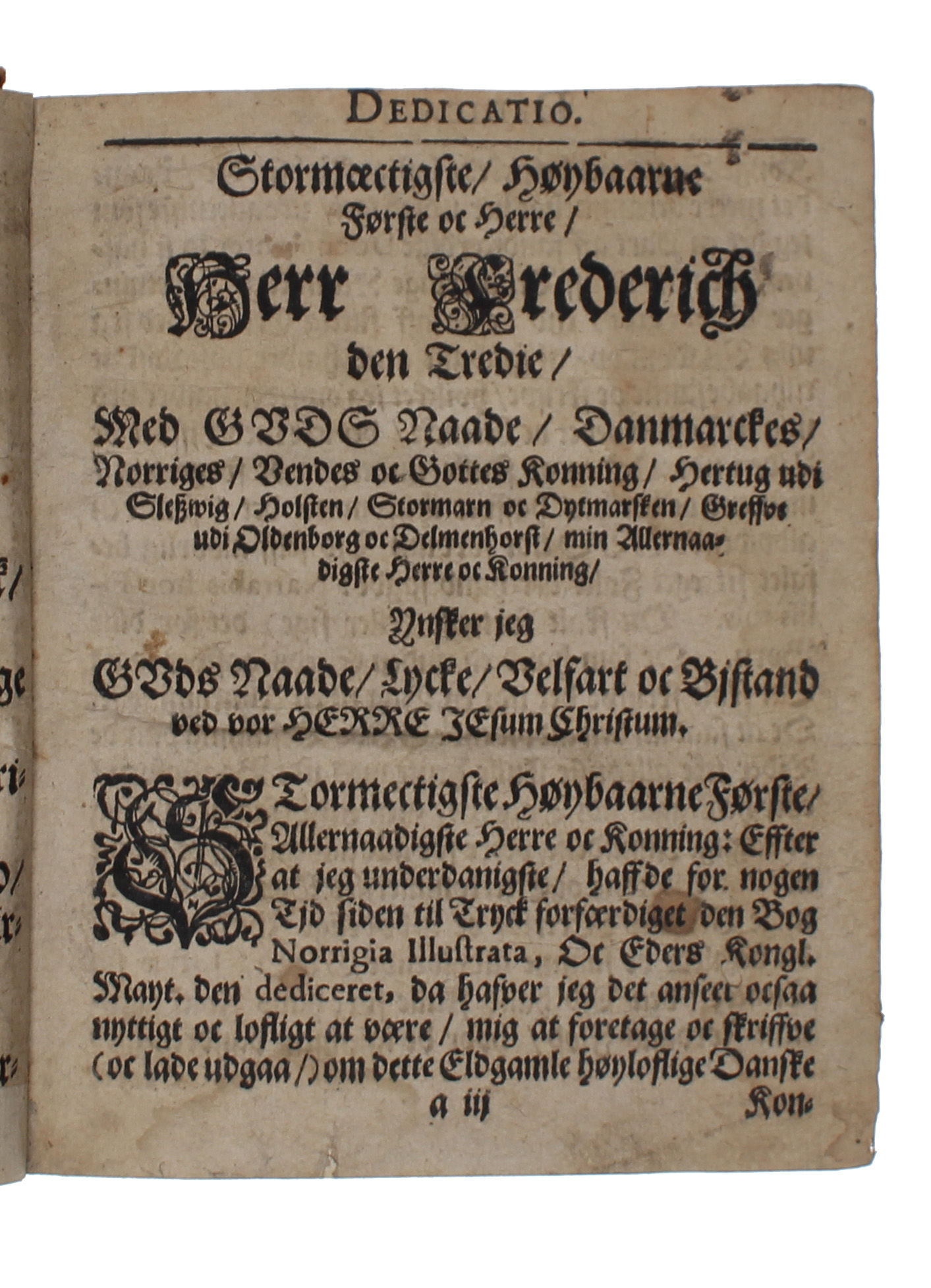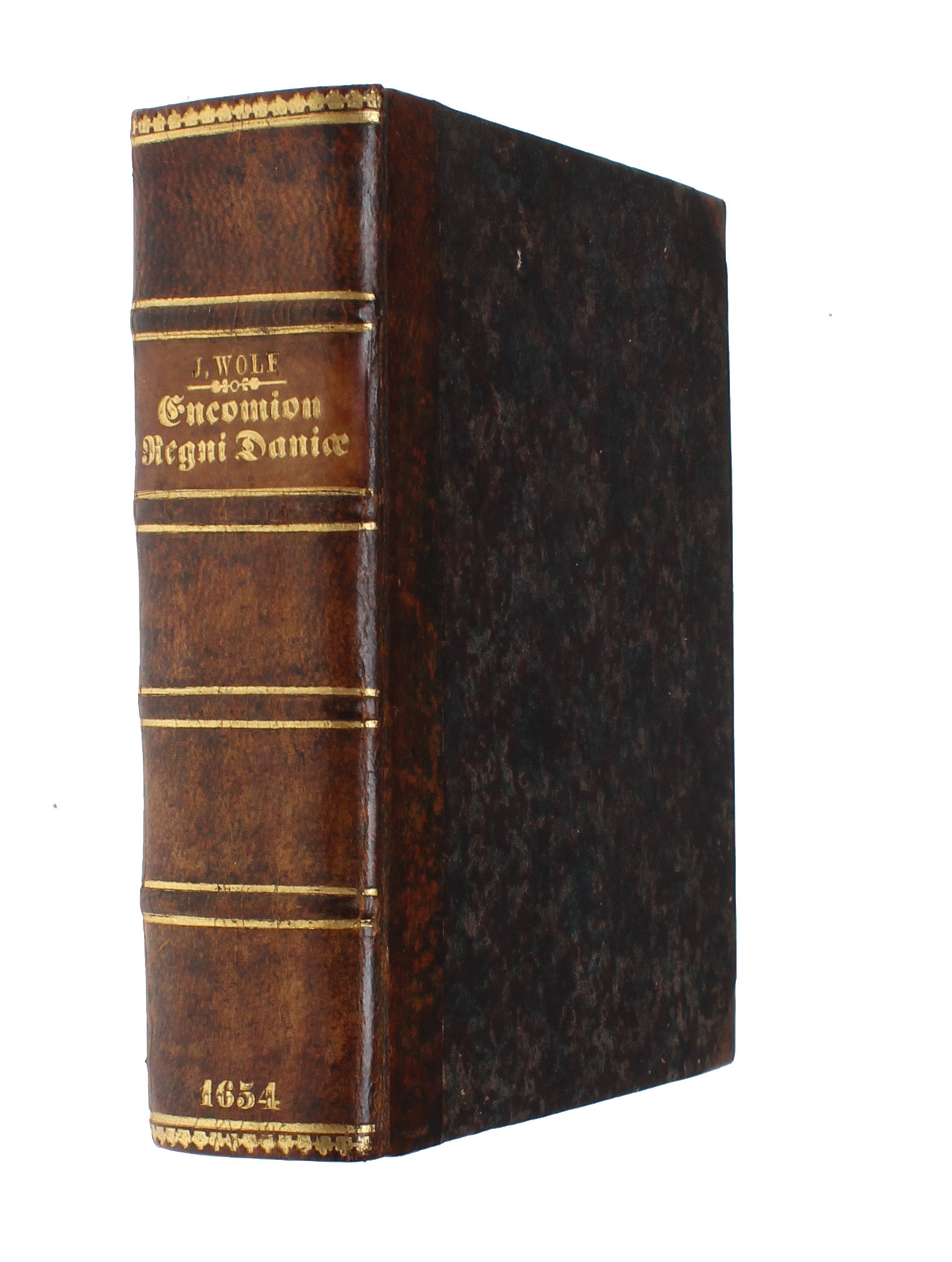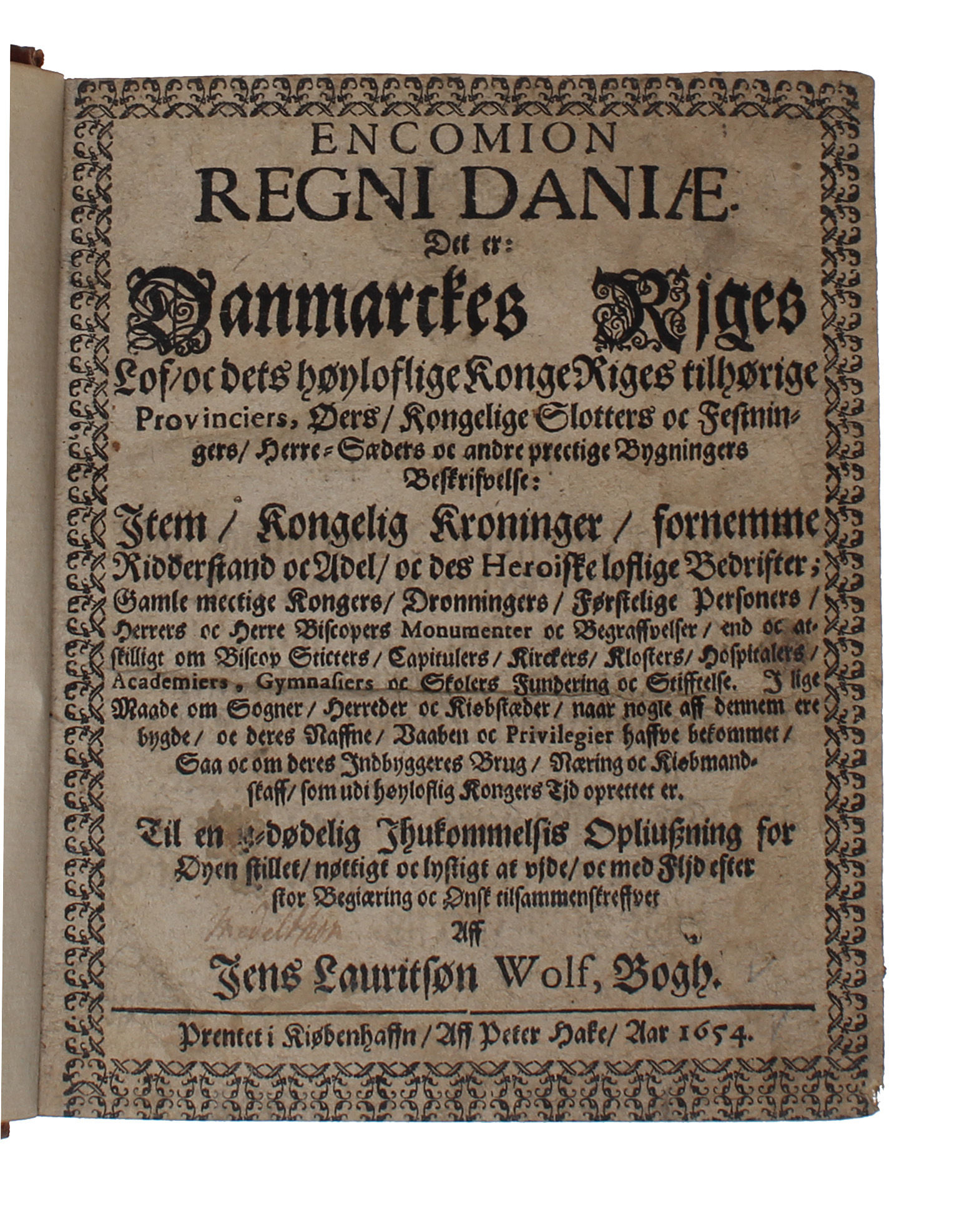 Kiøbenhaffn, Peter Hake, 1654. 4to. Smukt senere hldrbd., holdt i stilen med rygforgyldning og forgyldt skindtitel. (14),687,(4) pp. Med træsnit af Kong Dan på sidste dedikationsblad. Det træskårne titelblad mangler, her er kun det bogtrykte. Mangler endvidere pp. 1-2, 1 blad i Dedicatio med tab af en del af siden. Blad 187-88 med tab af nederste del af siden. Nogle blade kantforstærket. Lidt tæt beskåret. Midt i bogen et læg med en svag vandskjold.