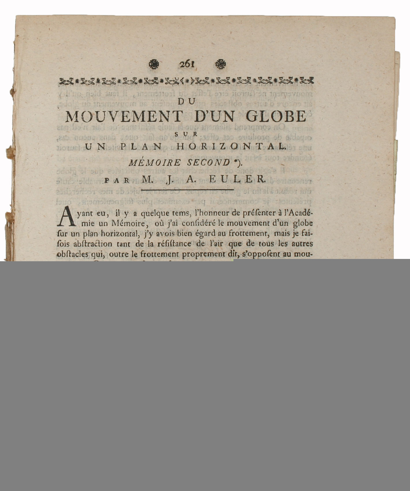 First printing of Johann Albert Euler's importent paper in which he set forth the so-called "Theorem of Johann-Albert Euler", stating that the trajectory of a ball is a parabola followed by a straight line. The eldest son of Leonhard Euler was a prominent geometer in his own right. In 1758, Johann-Albert Euler (1734-1800) published a study of the motion of a sphere on an horizontal plane in the presence of Newtonian friction. His main result would be rediscovered independently by Gaspard Coriolis as part of his authoritative theoretical work on the topic: Théorie mathématique des effets du jeu de billard (1835). Johann Albrecht Euler, born in St. Petersburg 1732 was a Swiss-Russian astronomer and mathematician and he was the first child born to the great Swiss mathematician Leonhard Euler.