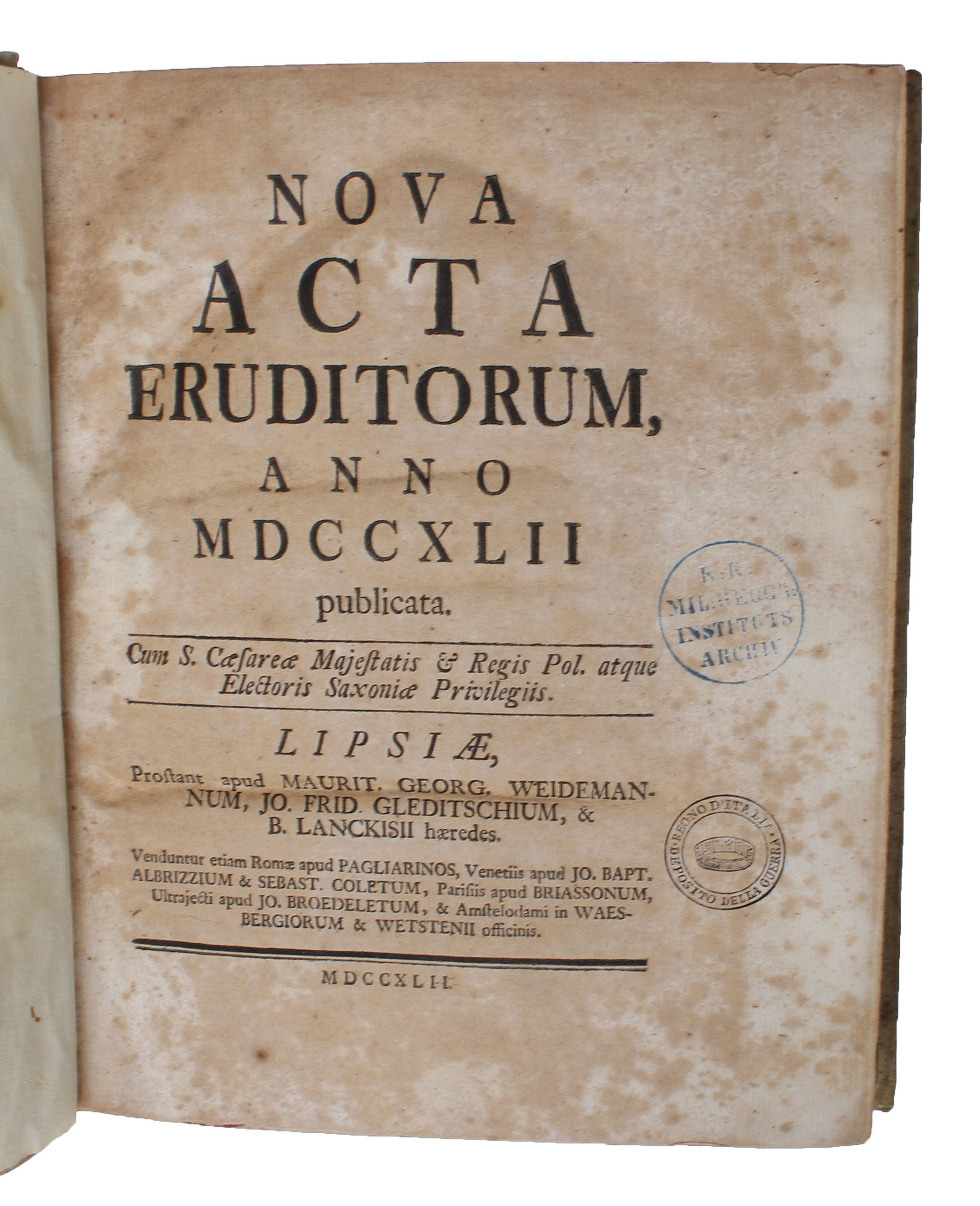 Leipzig, Grosse & Gleditsch, 1742. 4to. Contemp. full vellum. Faint handwritten title on spine. Two small stamps on titlepage. In: "Nova Acta Eruditorum Anno MDCCXLII". Occassional brownspotting. The entire volume offered. (4), 720, (33) pp + 6 engraved plates].
