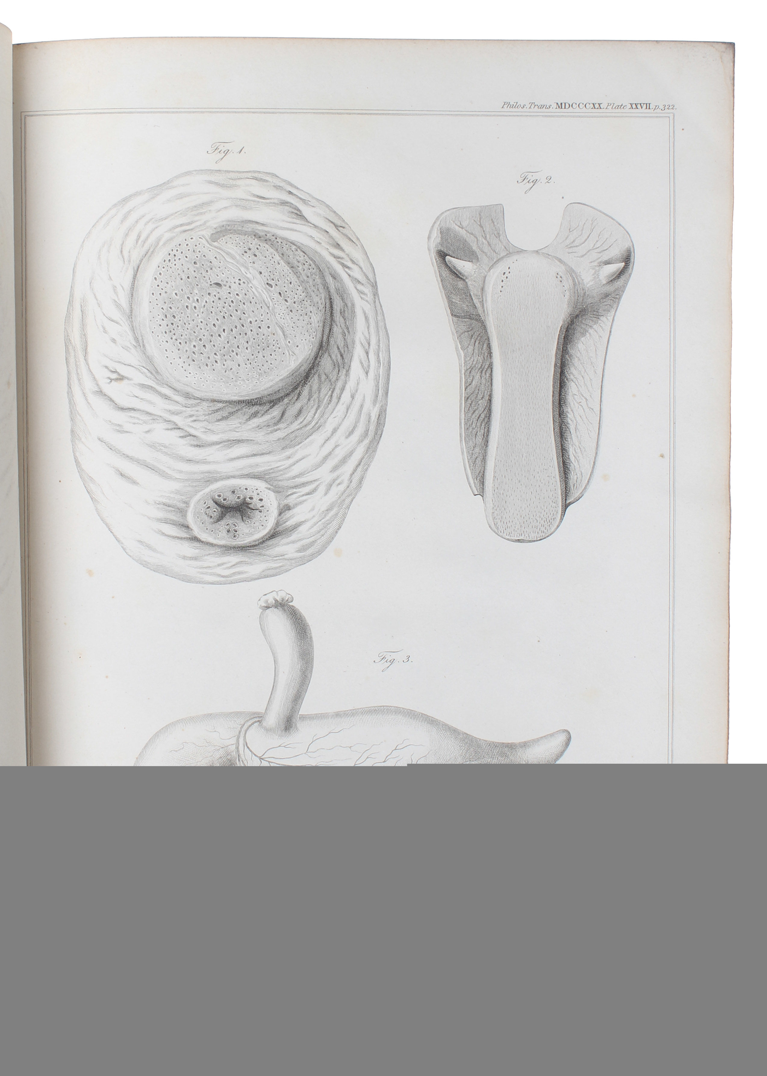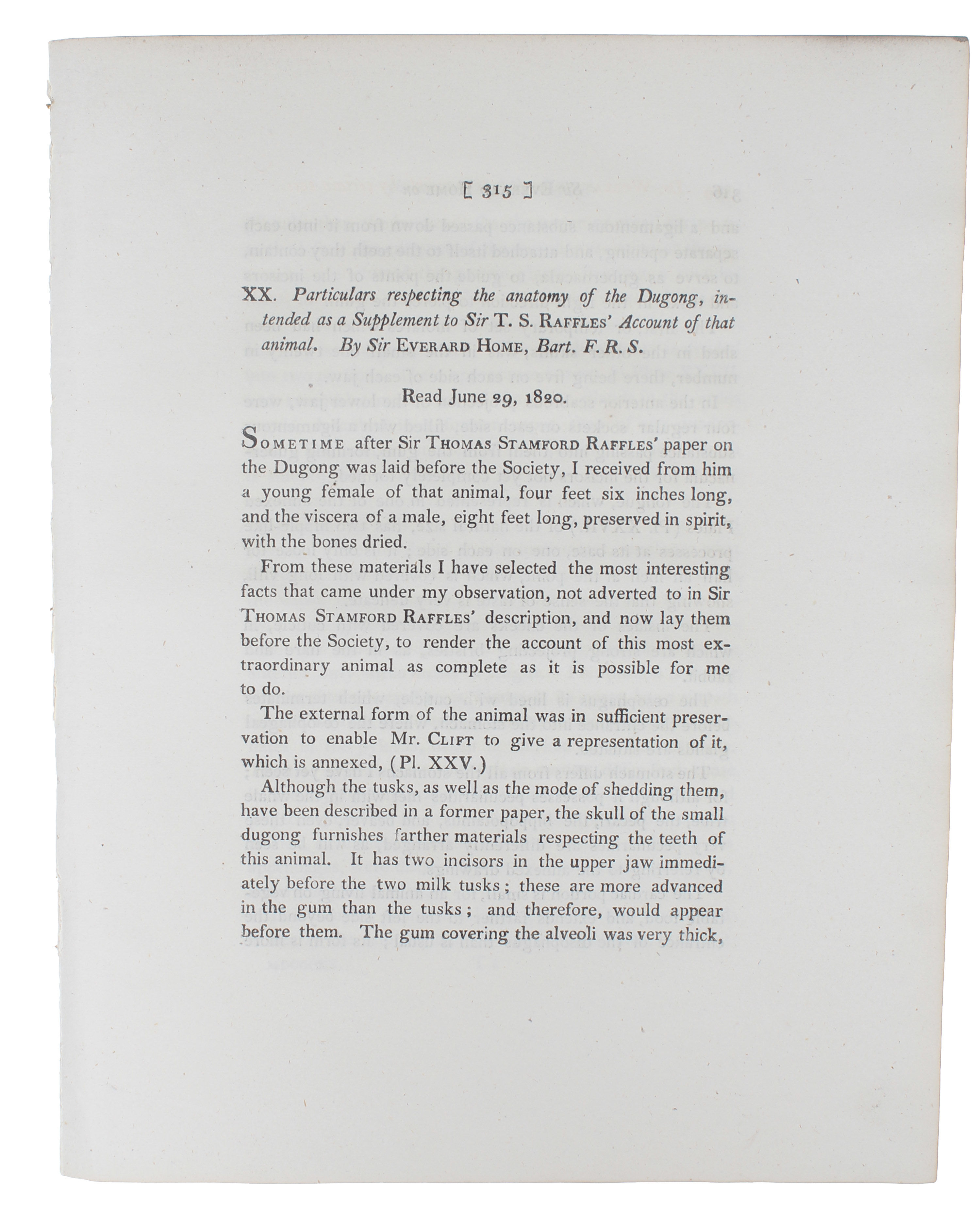 (London, G. and W. Nicol, 1820). 4to. No wrappers as extracted from "Philosophical Transactions" 1820 - Part II. Pp. 315-323 and 7 engraved plates depicting the Dugong and its internal parts.