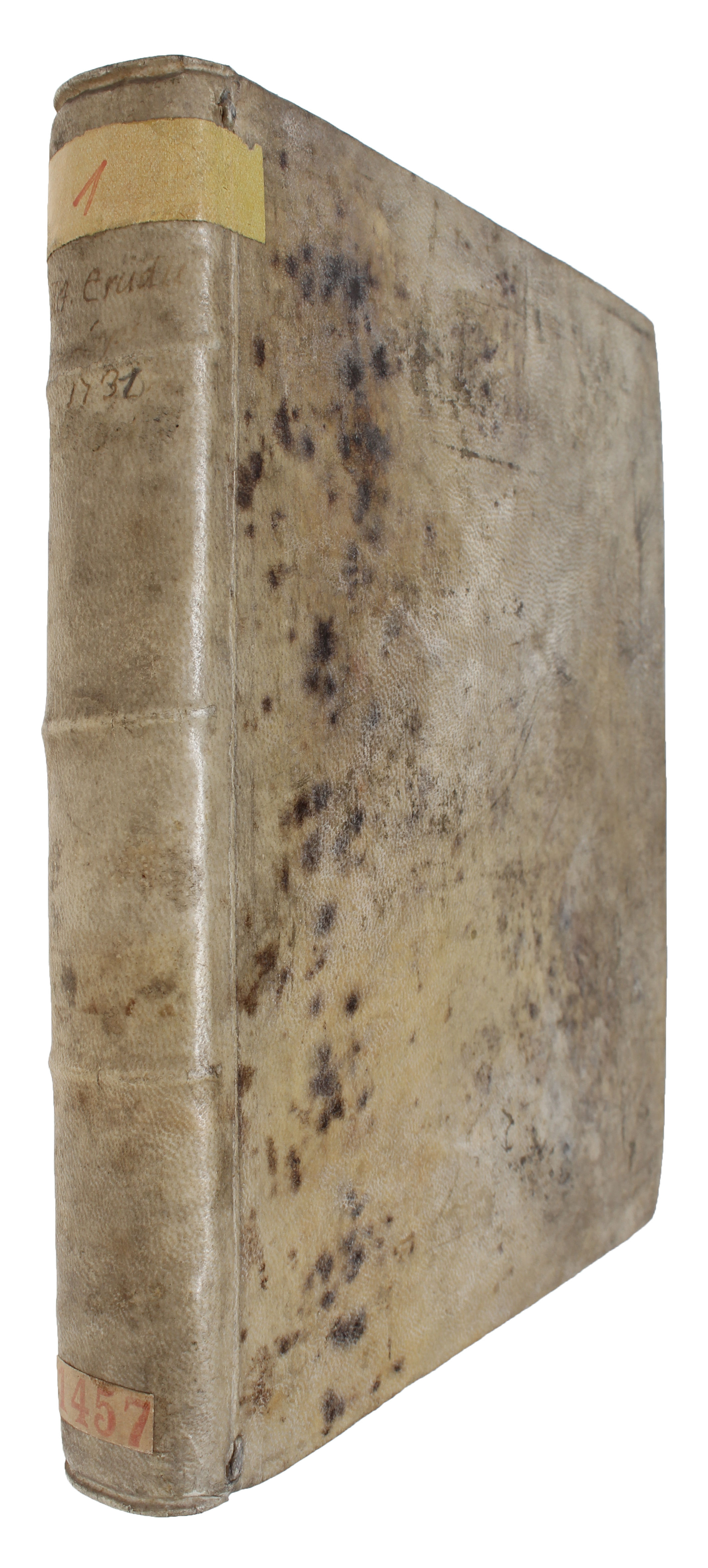Leipzig, Grosse & Gleditsch, 1731. 4to. In: "Acta Eruditorum Anno MDCCXXXI". The entire volume offered in contemporary full vellum. Front boards with some miscolouring. Hand written title on spine. A yellow label pasted on to top of spine. A small stamp to title-page and free front end-paper. Library label to pasted down front free end-paper. As usual with various browning to leaves and plates. (4), 560, (38) pp. + 1 plate.