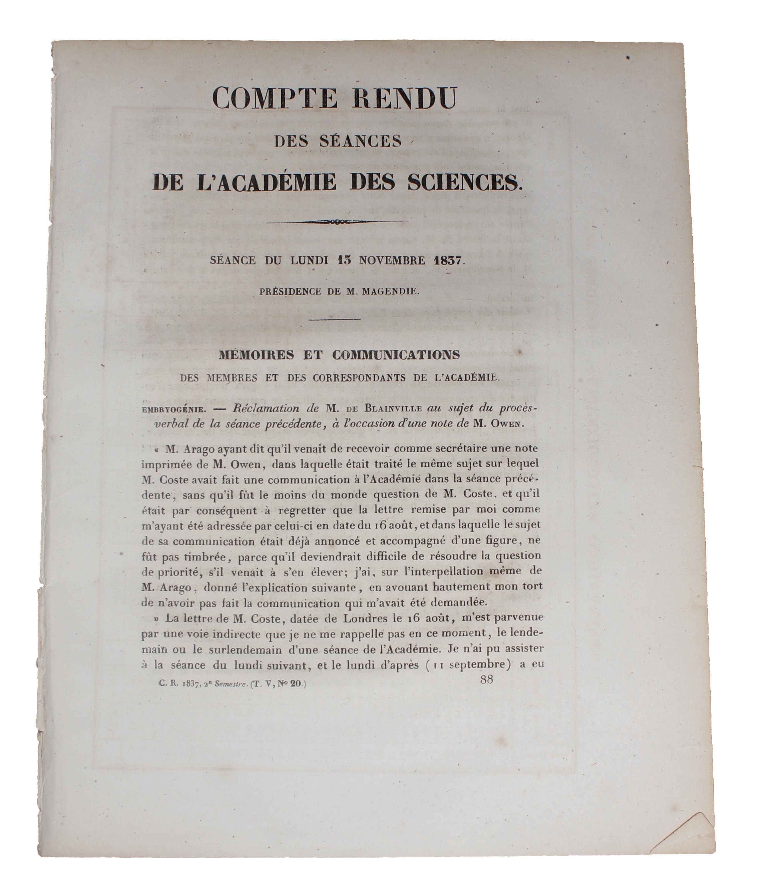 (Paris, Bachelier), 1837. 4to. No wrappers. In: "Comptes Rendus Hebdomadaires des Séances de L'Academie des Sciences", Tome 5, No. 20. Pp. (659-) 710. (Entire issue offerd). Poisson's paper: pp. 660-667.