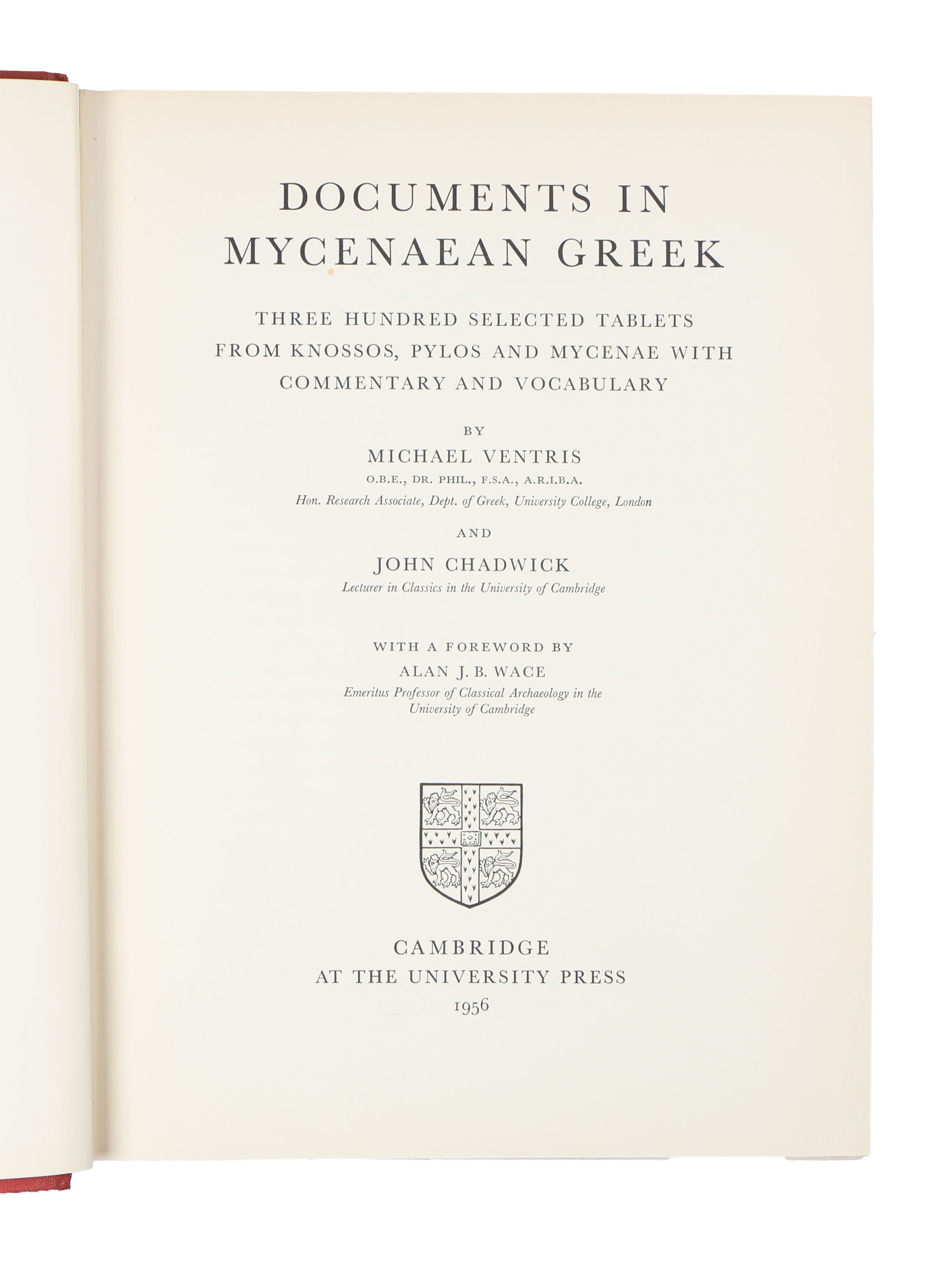 Documents in Mycenaean Greek. Three Hundred Selected Tablets from Knossos, Pylos and Mycenae with Commentary and Vocabulary. - [THE FIRST CORRECT DECIPHERING OF LINEAR B]
